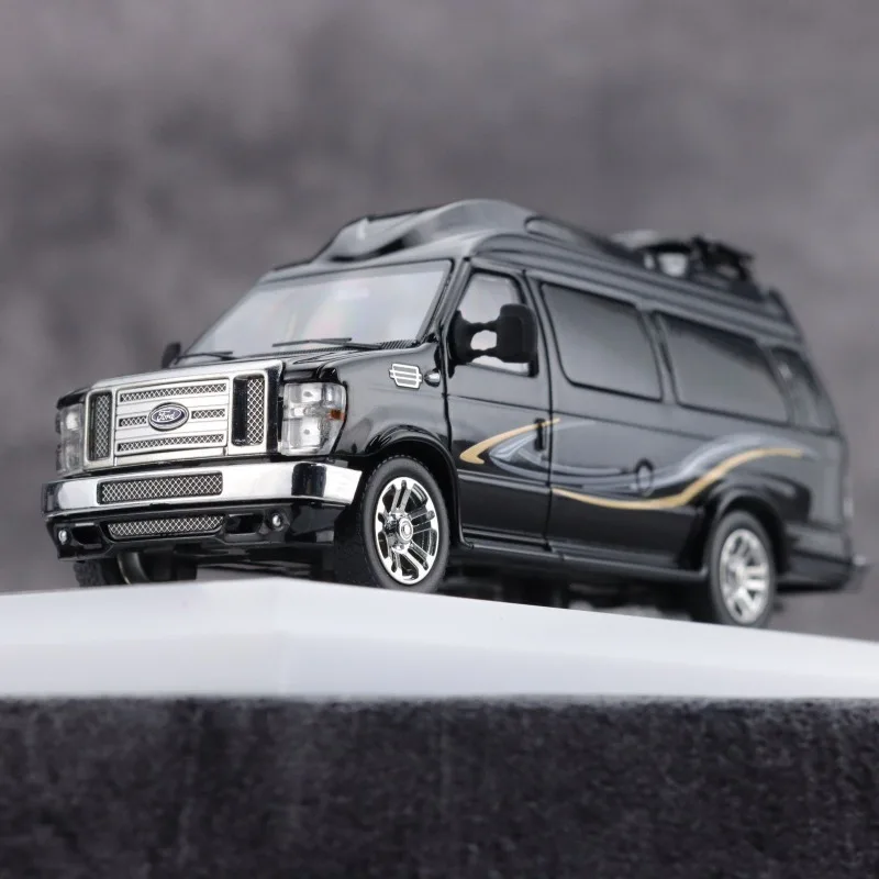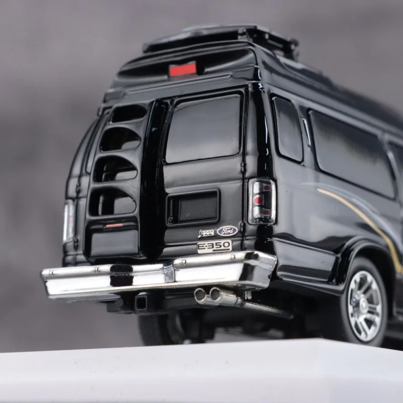 Experience the charm of this highly detailed miniature Ford E350 van, expertly crafted by Takara Tomy. With a sleek black glossy finish, it exudes a refined and modern aesthetic that appeals to enthusiasts and collectors alike. The model features a silver grille with the iconic Ford logo, clear realistic headlights, and a subtle bumper trim that adds to its authenticity. Its aerodynamic corners and raised roof suggest spaciousness and practical design. A stylish silver and gold decorative stripe runs along the side, adding visual dynamism. The black roof rack and multi-spoke silver wheels further enhance its realistic look. Perfect for display, gifting, or collecting, this model captures the essence of a professional, high-quality die-cast vehicle.