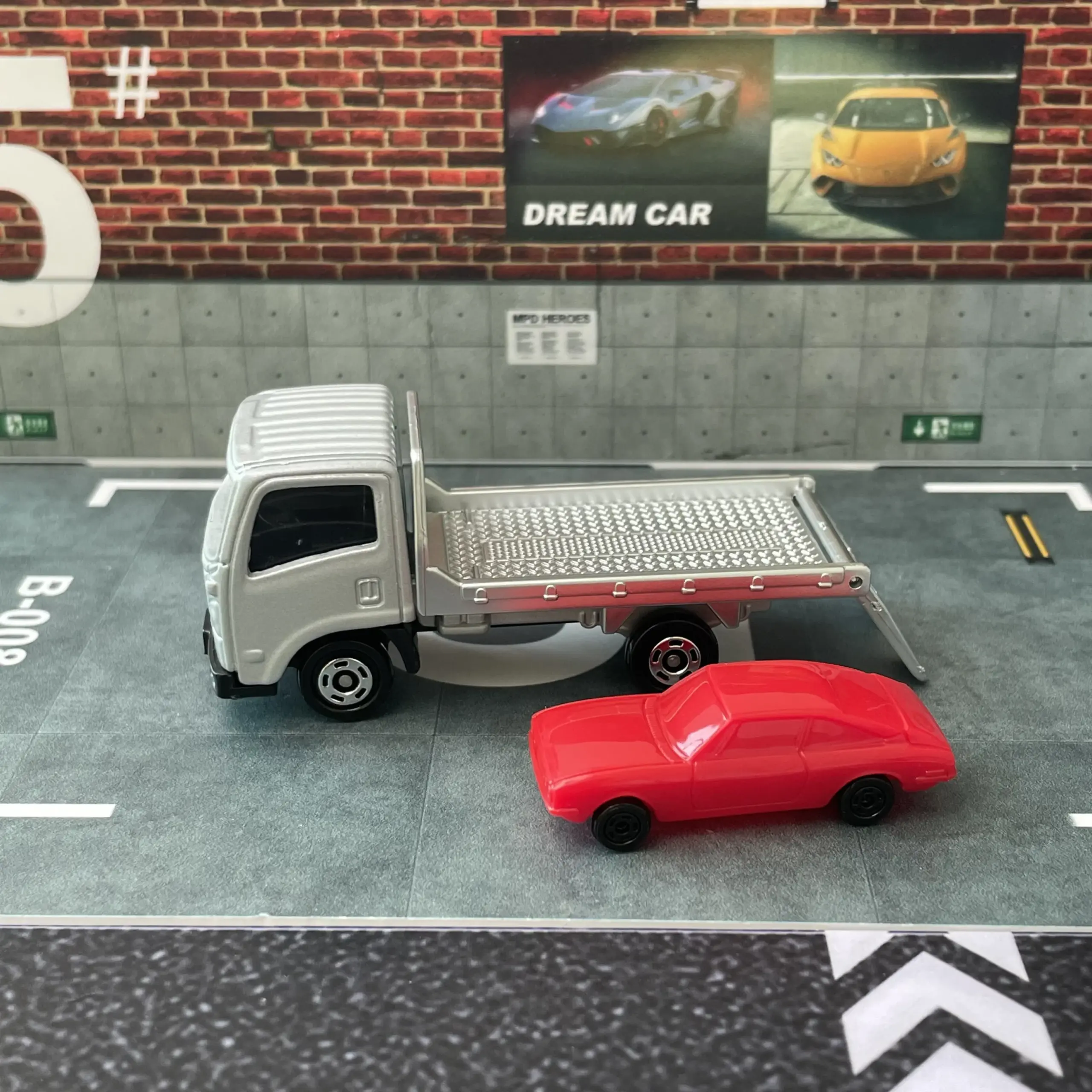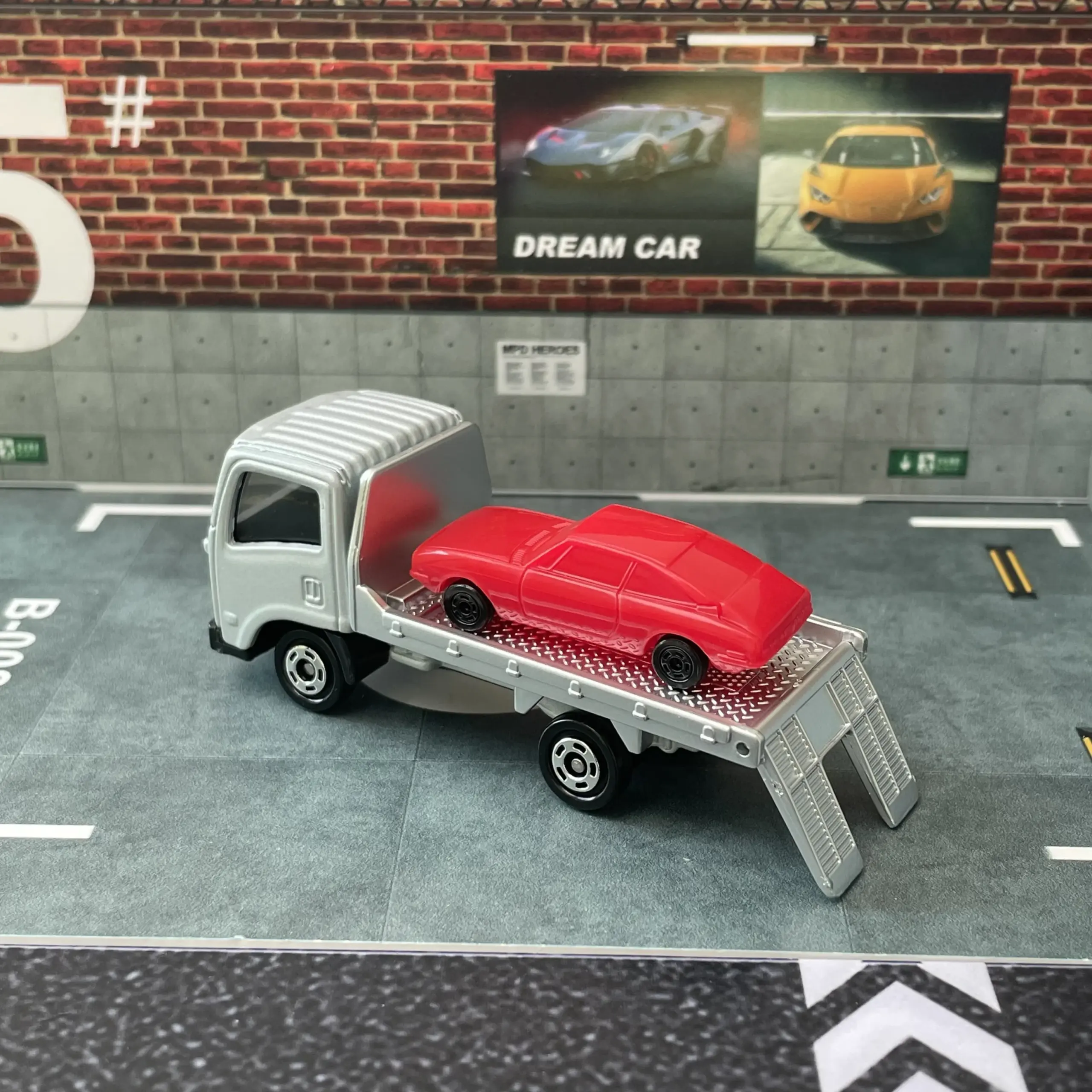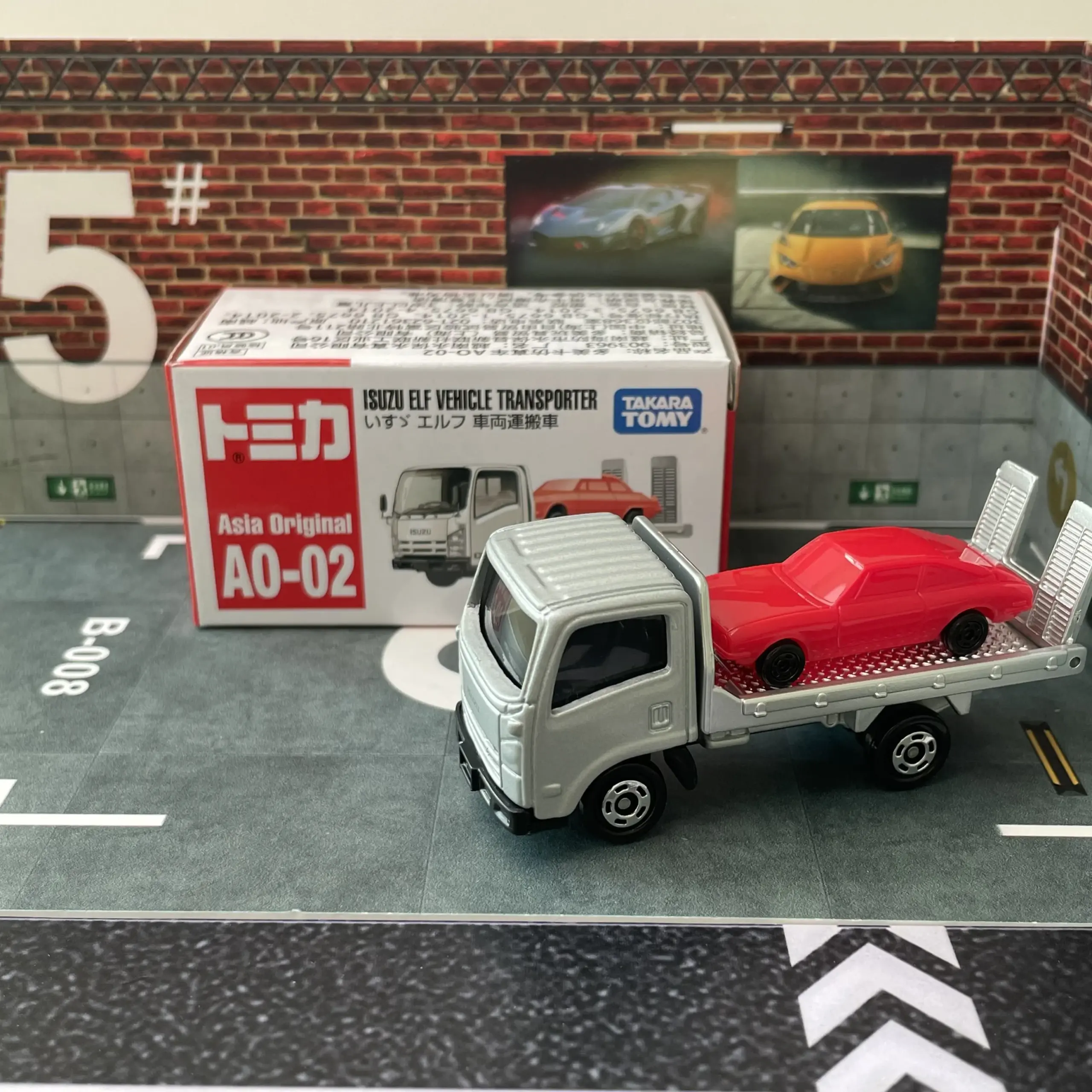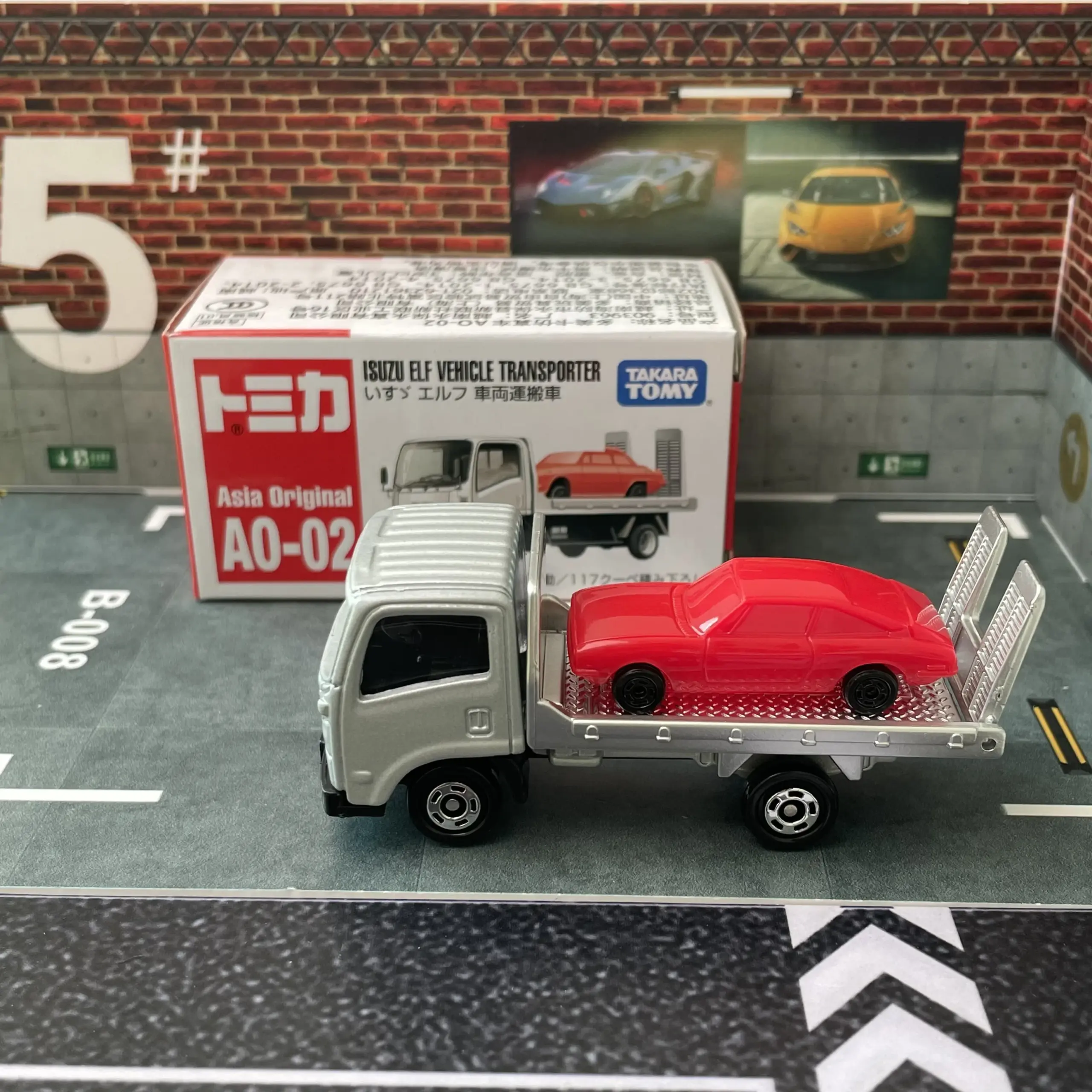 This meticulously crafted diecast model features a 1:64 scale Isuzu Carrier truck, made of durable metal with no chemical concerns, ensuring a safe and realistic collectible. Branded by TAKARA TOMY, it showcases a detailed silver cab with black side mirrors, windshield wipers, and bumper, paired with a flatbed loaded with a classic red car featuring intricate design lines, windows, and wheels. The model’s realistic proportions and striking contrast of metallic silver, vibrant red, and black accents make it perfect for display and collection. Designed for enthusiasts aged 14 and older, it offers an authentic and detailed miniature depiction of a professional transporter.