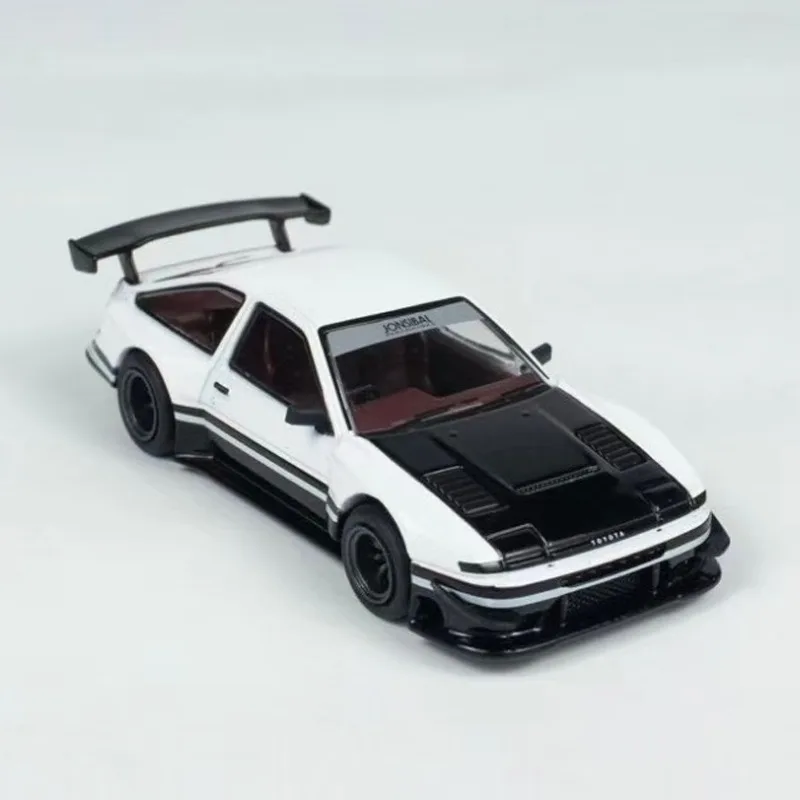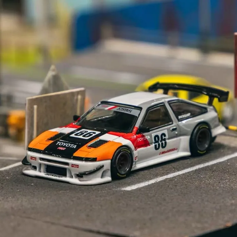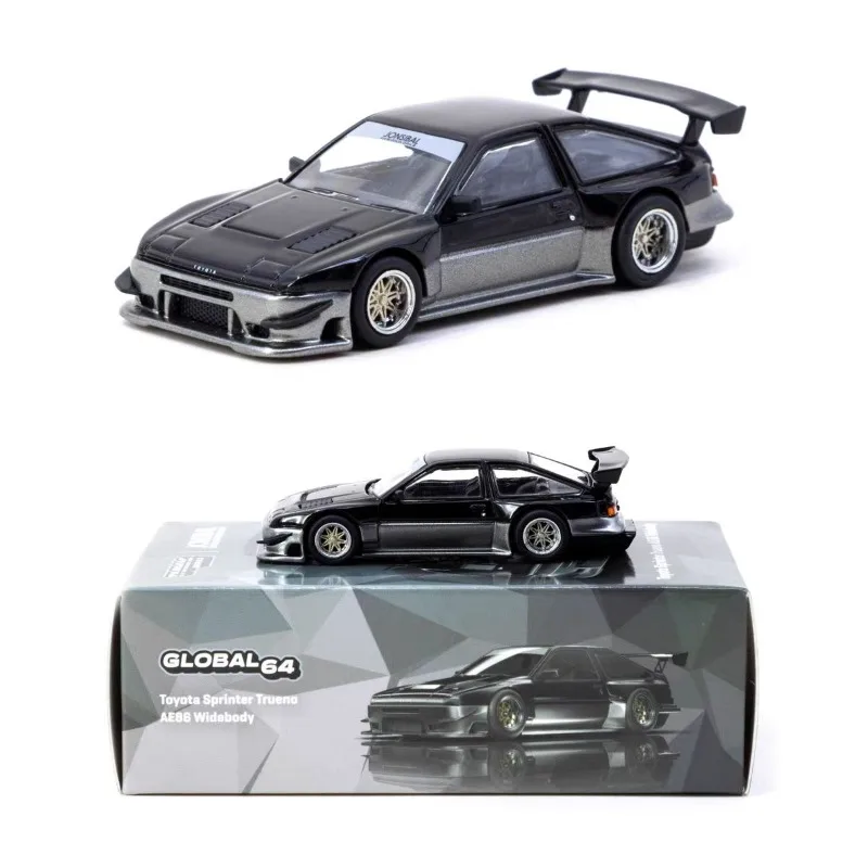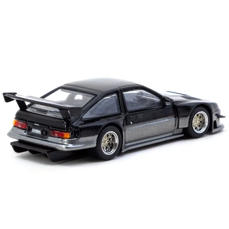 Experience the thrill of owning a meticulously crafted 1:64 scale replica of the iconic Toyota Sprinter Trueno AE86. Made from die-cast metal, this model captures the essence of racing with its sleek, black matte or semi-gloss finish. Its aerodynamic, wedge-shaped body, flared wheel arches, and detailed rear wing evoke a true high-performance look. The intricate gold-colored multi-spoke wheels complement the sporty stance, while transparent windows reveal a detailed interior. Whether displayed on a shelf or part of a collection, this model offers a dynamic combination of style and precision, perfect for enthusiasts who appreciate both design and authenticity. It's a must-have for collectors seeking a striking tribute to racing history.
