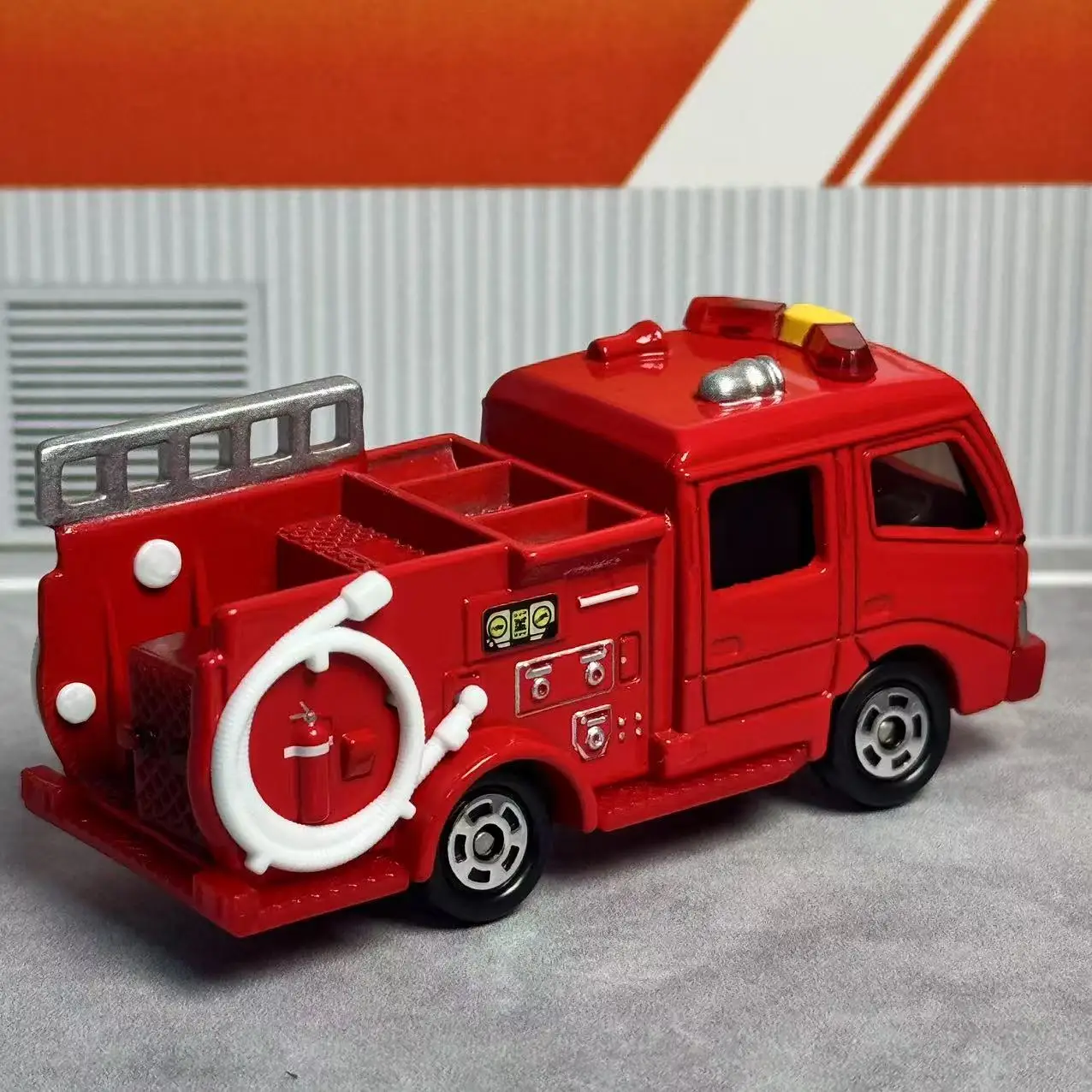 Step into the world of emergency rescue with this highly detailed Takara Tomy Morita Fire Engine diecast model in NO.41. Crafted with precision and made entirely of metal, this 1:64 scale replica captures every authentic detail of a real fire truck. Its vibrant red finish highlights the aerodynamic cab, featuring black-tinted windows for a realistic touch. Silver accents on the roof-mounted light, siren, and ladder add a touch of authenticity. The body includes painted control panels in yellow and black, along with a large white flexible hose coiled on the side, detailed hoses, and painted containers. The tires have textured black tread patterns mounted on intricate silver rims, making this model a perfect collector’s piece or display item for fire truck enthusiasts.