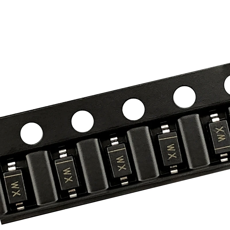 Experience precise voltage stabilization with this high-quality, surface-mount diode from Takin. Designed for seamless integration into your electronic circuits, this component features a sleek, rectangular form with a smooth black body that highlights its modern, minimalist aesthetic. Available in two package types—SOD-123 labeled WX and SOD-323 labeled WX—these diodes provide flexibility for various assembly needs. The silver-colored terminals extend horizontally from the shorter sides, slightly bent downward for easy mounting. With clear, crisp white markings, these components ensure reliable identification and perfect functionality. Whether for prototyping or final production, this diode offers a clean, professional look along with guaranteed performance. Add this reliable diode to your toolkit and enjoy seamless installation and operation.
