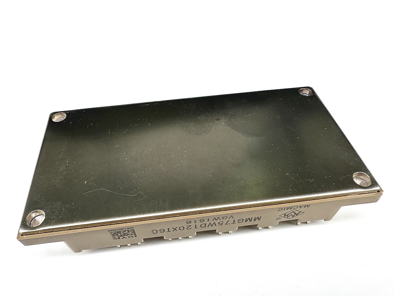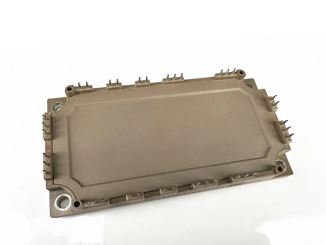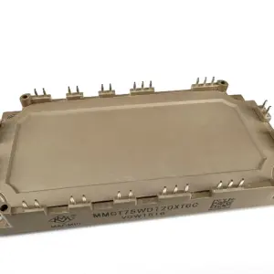 Experience reliable high-power performance with this new MMGT75WD120XT6C IGBT module from Takin Chip. Featuring a durable, beige or light gold-colored rectangular casing in a DIP package, it combines sleek industrial design with practical functionality. The module boasts multiple evenly spaced, metallic pins—likely gold- or tin-plated—for optimal conductivity and corrosion resistance. Reinforced mounting holes at each end ensure secure attachment to heatsinks or chassis, while a flat bottom surface provides stability. Embossed border patterns along the edges add structural integrity and heat dissipation benefits. Ideal for advanced electronic applications, this high-quality module offers durability, efficiency, and easy installation in power switching circuits.