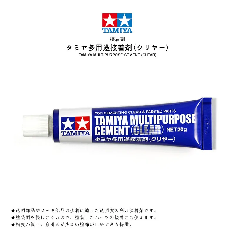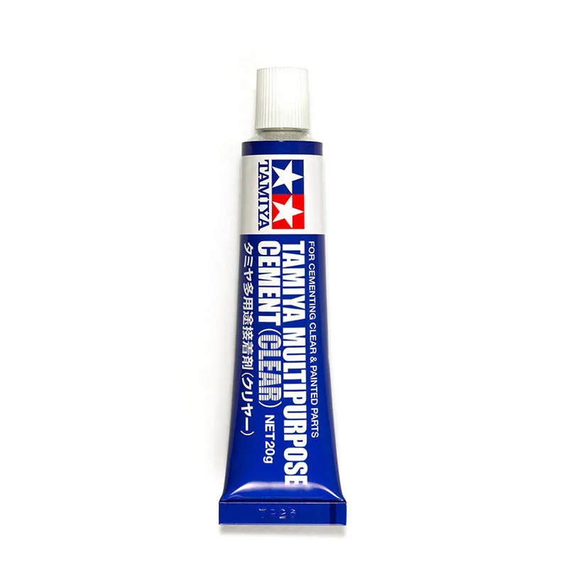 This TAMIYA 87188 Multipurpose Cement (Clear) is a high-transparency adhesive designed for bonding clear and painted plastic parts in model craft applications. Packaged in a sleek blue plastic tube with white and red accents, it contains 20 grams of versatile, easy-to-apply cement. The packaging features a rich blue background with bold white text highlighting its name and net weight, along with Japanese characters and detailed product information. Ideal for model builders seeking precise, durable bonds, this clear cement offers a reliable solution for crafting and repairing plastic components, ensuring a clean finish with no visible adhesive residue.