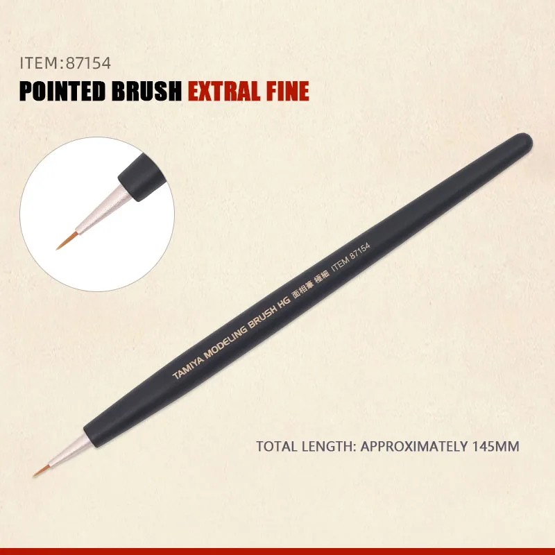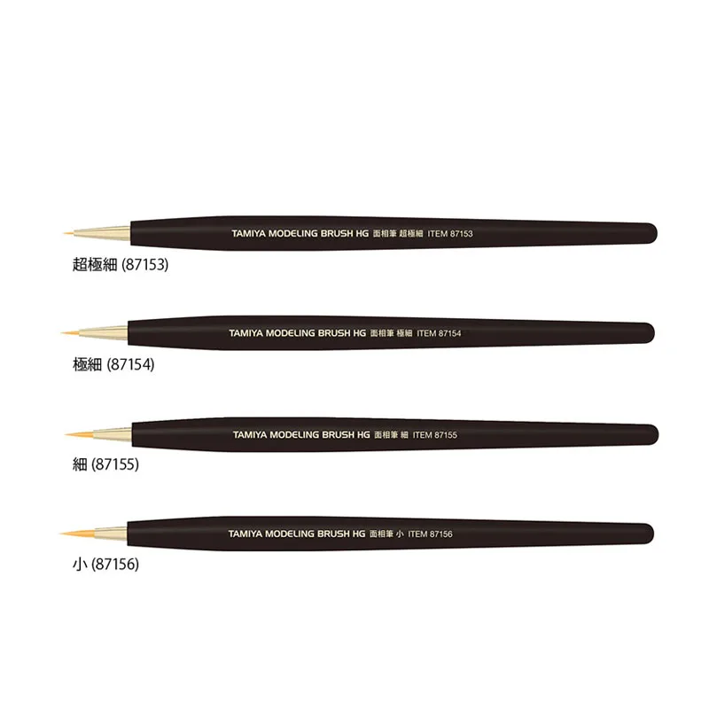 Imagine the precision of your next plastic model project with the TAMIYA Modeling Brush HG set. This exquisite collection includes four brushes designed specifically for detailed painting tasks: Ultra Fine (87153), Extra Fine (87154), Fine (87155), and Small Pointed (87156). Each brush features a sleek black handle for comfort and control, allowing you to create intricate designs effortlessly. The finely pointed synthetic fiber brush heads ensure smooth application of colors, making your models come to life just as you envisioned. Experience the joy of painting with these professional-quality tools that every hobbyist and enthusiast craves.