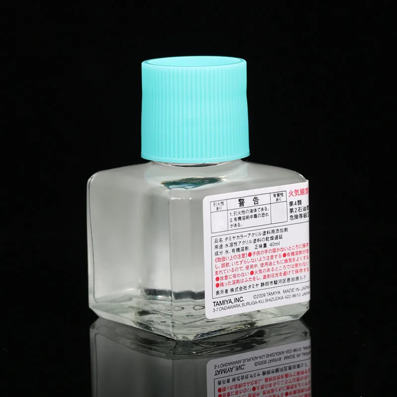 The TAMIYA Paint Pencil Mark Remover, model number 87114, is a water-based auxiliary material tool designed for model coloring. Encased in a square, transparent plastic bottle, it showcases a clear liquid that effectively retards and smooths surfaces during coloring, particularly with acrylic pigments. The distinctive aqua blue twist-on cap features a ribbed texture for enhanced grip, complemented by a stylish silver metallic ring. The prominent label displays the TAMIYA brand logo in red and blue, ensuring easy identification. With a net volume of 40ML, this professional-grade remover is essential for hobbyists and model enthusiasts seeking precision in their projects.