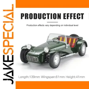 Experience the beauty of vintage sports cars with this detailed 1/24 scale TAMIYA Super 7 Series II model kit. Perfect for hobby enthusiasts, it offers an exact replica of a lightweight, open-top two-seater sports car. Its glossy, deep green finish emphasizes elegant curves and classic design elements. The model features meticulously crafted components: a realistic straight-four engine with detailed carburetor, exhaust pipe, and transmission; etched features like air funnels, grille, and seat belts; electroplated lamp rings and wheel covers; and optional parts for road or racing configurations. Whether you’re assembling for your collection or display, this model provides excellent craftsmanship and authentic style, making it an excellent addition to any hobbyist’s collection.