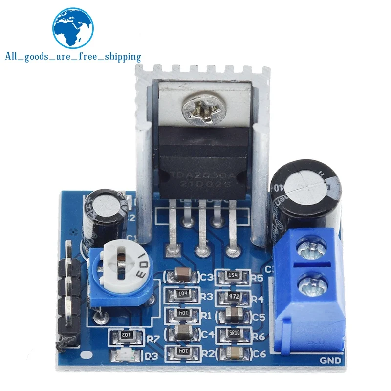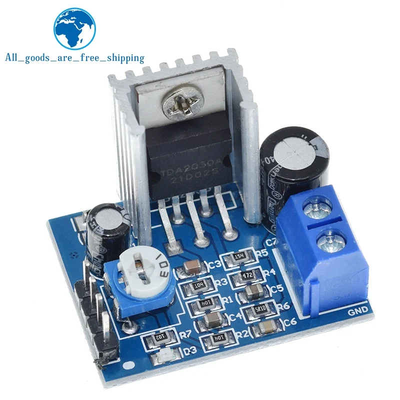 Enhance your audio projects with this compact TDA2030-based audio amplifier module, available in 1 or 3-piece packages. Designed for voltage regulation from 6V to 12V, it delivers up to 18W of power, making it ideal for switching, sensing, and electronic applications. Crafted with surface-mounted components, the module features a sleek blue PCB with organized circuitry, a metallic heat sink for efficient heat dissipation, and secure screw terminal connections for reliable setup. Operating within a broad temperature range of -40°C to +85°C, this new and unused module offers professional-grade reliability and performance for your DIY or professional electronics projects.