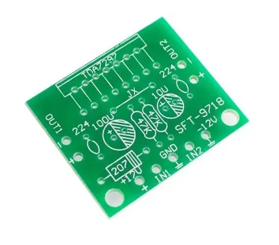 Experience the satisfaction of building your own audio amplifier with this compact, visually appealing green circuit board. Designed for ease of use, it features clear white silkscreen markings for connection points and component labels, making assembly straightforward. The vibrant green supports a clean, modern aesthetic, complemented by multicolored resistors and yellow ceramic capacitors that provide visual contrast and technical clarity. The sleek black TDA7297 integrated circuit lends a professional look, emphasizing reliability and performance. Ideal for personal hobby projects or custom audio systems, this board offers dual-channel output, delivering 15W per channel with a 12V DC power supply. Its organized and accessible design invites you to explore and create with confidence, knowing you have a high-quality, precise component suited for your audio DIY needs.