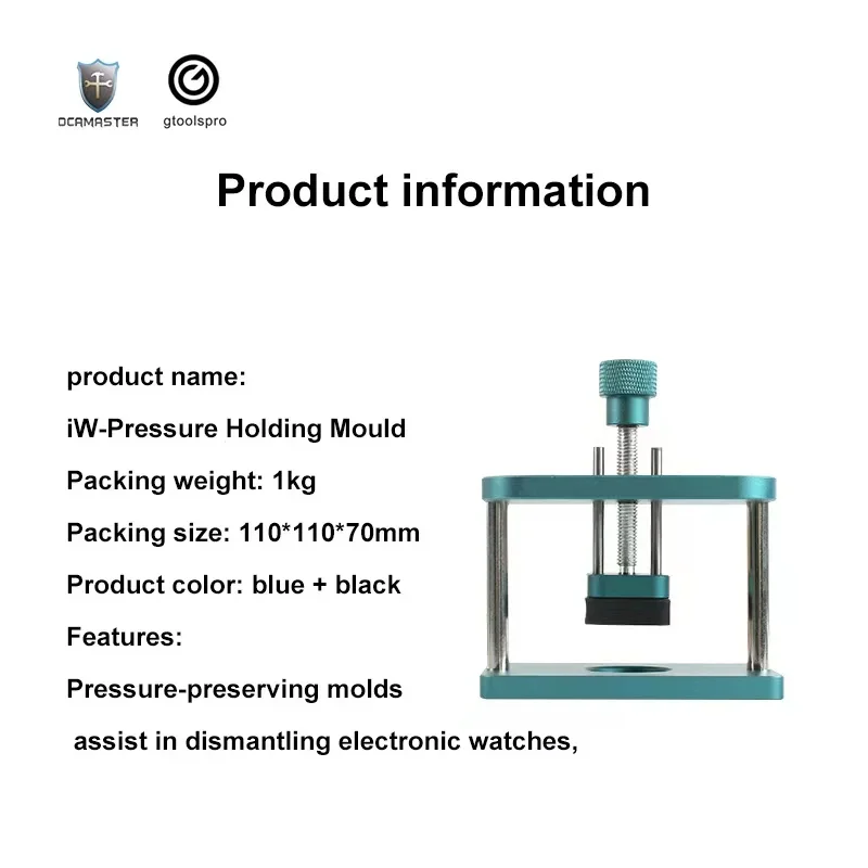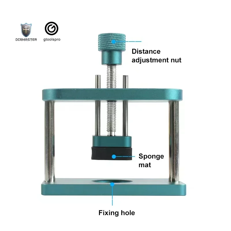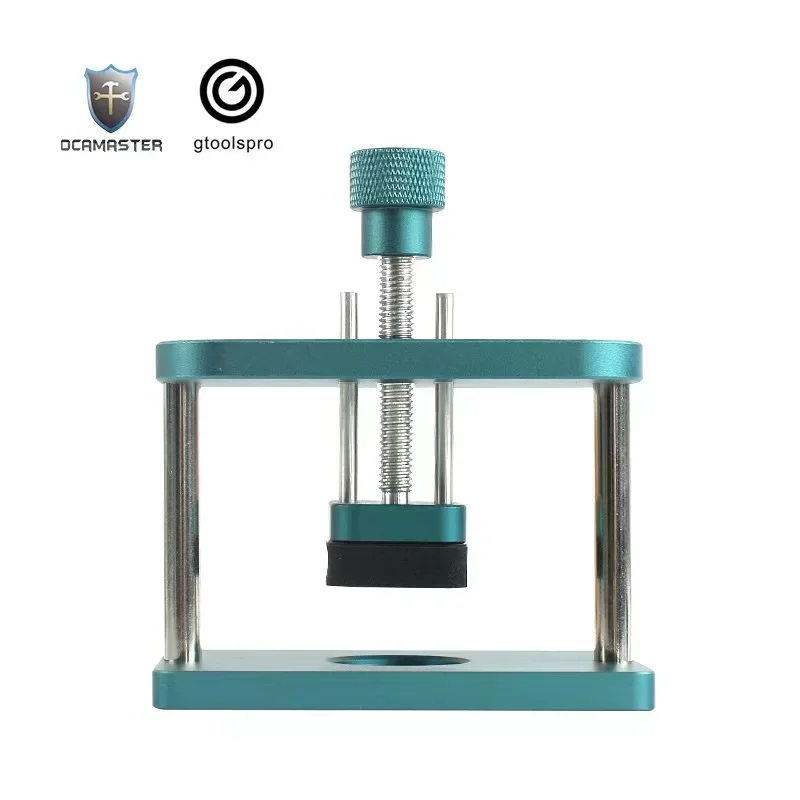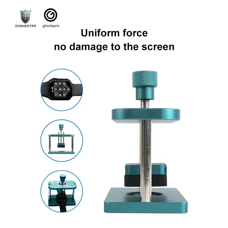 The GO-011 pressure maintenance mold is a durable metallic tool designed specifically for Apple Watch models 1 through 6 and SE, aiding OLED screen repairs. Featuring a sleek, teal-colored finish, it includes a textured knurled knob for precise pressure adjustment and a sturdy rectangular frame supported by four vertical rods for stability. The mold’s flat pressing surface, along with a black silicone contact pad, ensures even pressure distribution while protecting the watch during repairs. Compact and professionally crafted, this combination tool is ideal for both DIY enthusiasts and professionals seeking to maintain optimal pressure during delicate screen replacement or OLED repair procedures on compatible Apple Watches.