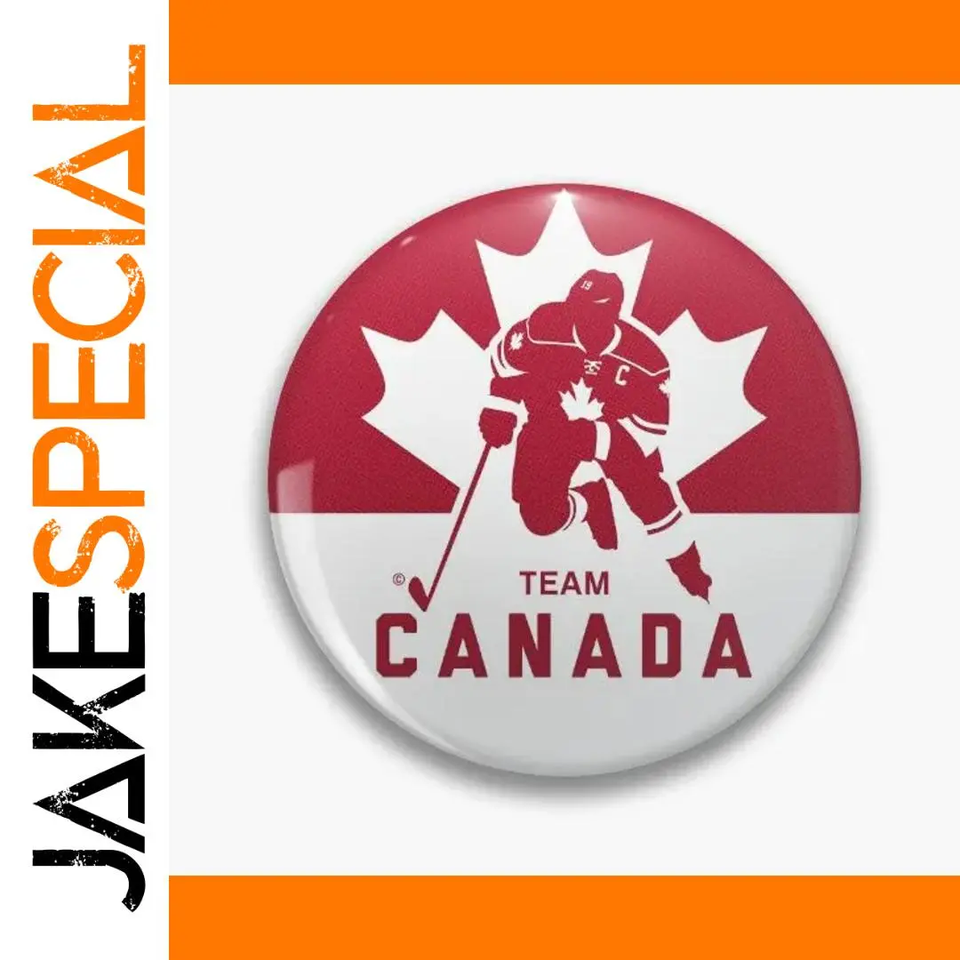 Imagine proudly wearing this vibrant lapel pin, showcasing Canada's beloved hockey culture with a fun, cartoonish twist. Its glossy surface features a striking red background with a crisp white maple leaf emblem, symbolizing national pride. Centered within the leaf is a lively silhouette of a hockey player in action, depicted with bold, minimal details to emphasize movement and energy. Below, the bold “TEAM CANADA” text in dark letters completes the lively design. Available in various sizes from 32mm to 75mm, this pin is perfect for expressing team spirit on hats, jackets, or bags, and makes an ideal gift for hockey fans or Canadian pride enthusiasts alike. Its playful style adds a touch of sport-inspired charm to any outfit.
