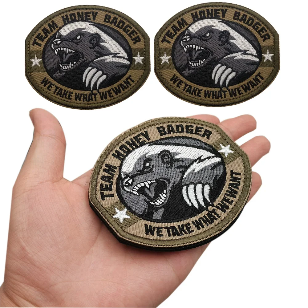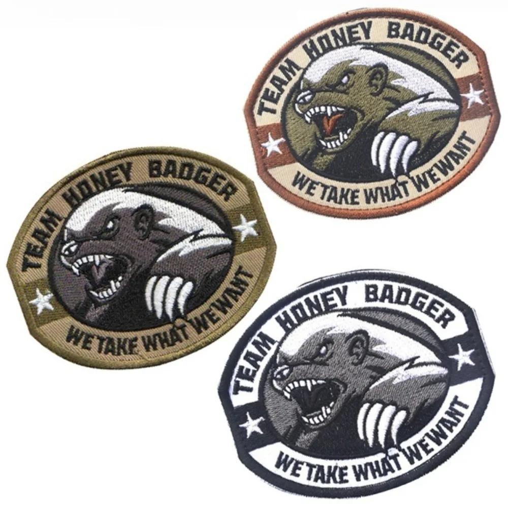 Introducing the “TEAM HONEY BADGER” tactical patch, measuring 9cm x 7.5cm, expertly crafted from durable nylon and polyester. This unisex patch showcases a fierce embroidered honey badger design, complete with sharp teeth and claws. Choose from three striking color schemes: brown with olive and cream, black and gray, or green with light beige. The bold text “WE TAKE WHAT WE WANT” is highlighted with star accents, emphasizing its military aesthetic. With a convenient hook and loop backing, easily attach this distinctive patch to jackets, backpacks, hats, military vests, and DIY clothing for a rugged look.