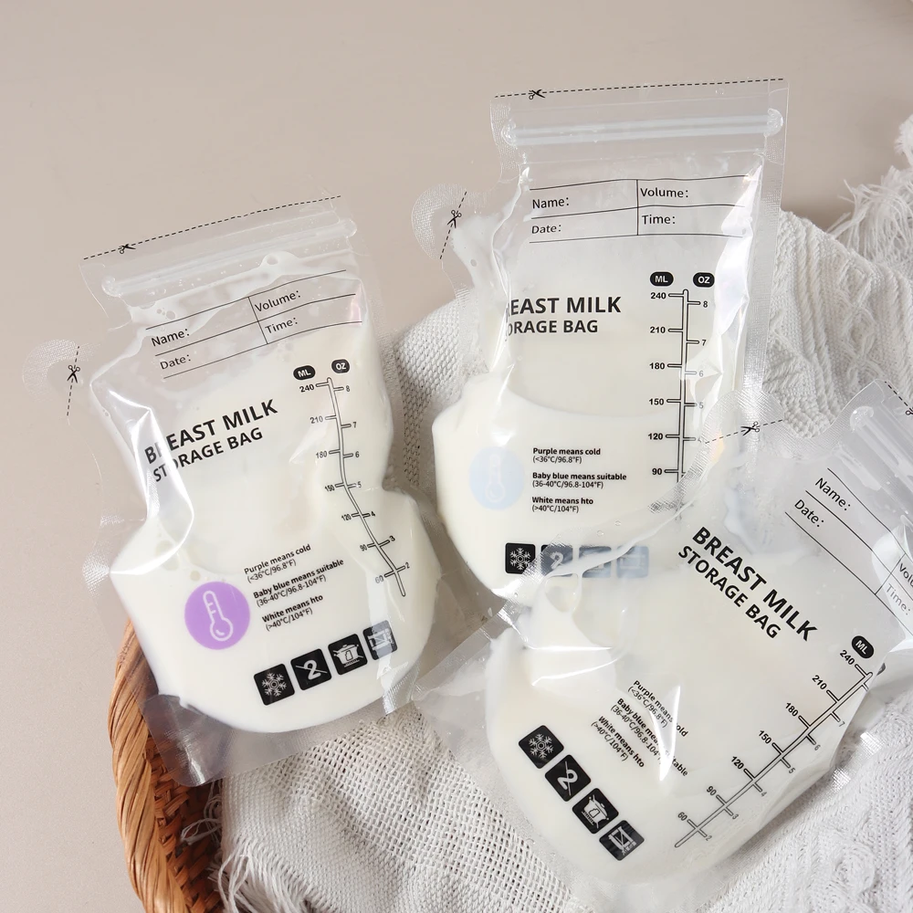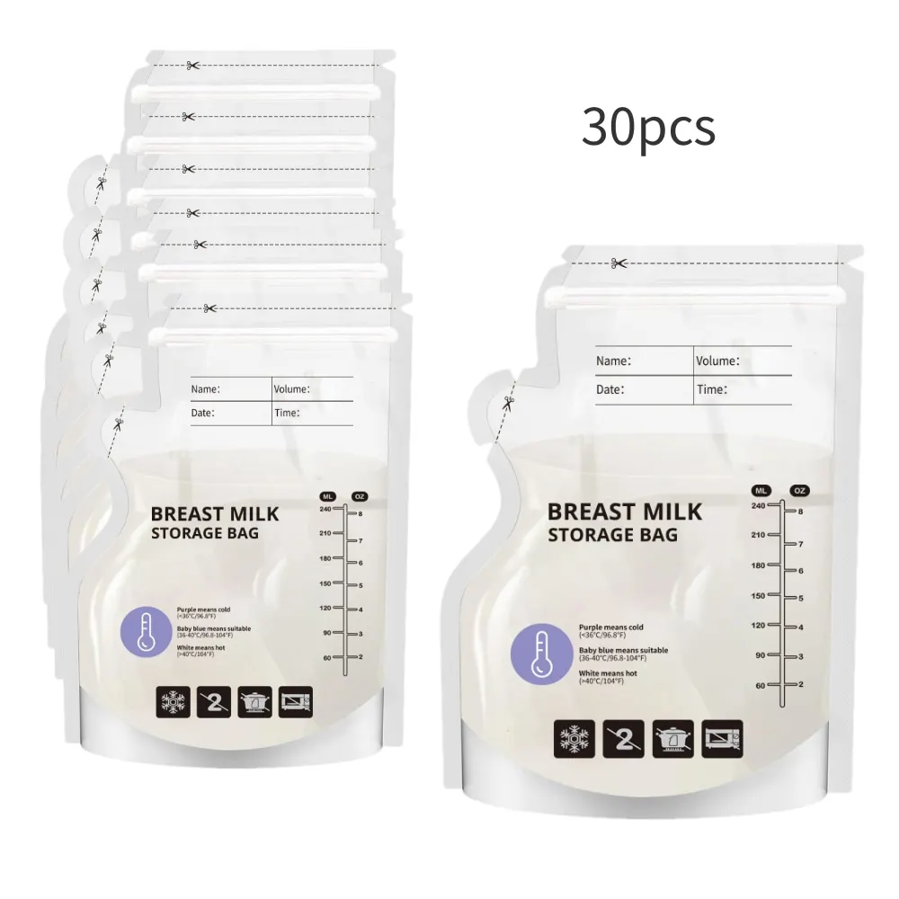 Experience convenience and peace of mind with this set of 60 disposable, pre-sterilized breast milk storage bags. Crafted from food-grade, leak-proof transparent PE material, these bags are designed for practical use with a 240ml capacity. The sleek, minimalist design features measurement lines for accurate volume monitoring, ensuring you’re always aware of how much milk you’ve stored. The temperature-sensitive feature allows you to easily identify whether the milk is warm, cold, or hot, with color-coded temperature indicators—purple for cold, blue for suitable, and white for hot. This thoughtful design simplifies daily feeding routines, making storage and warming safer and more manageable. Ideal for busy parents who prioritize safety, hygiene, and efficiency in caring for their little ones.