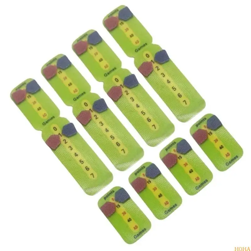 Imagine yourself seamlessly keeping score during a tennis match with this stylish and practical scorekeeping set. Designed to attach effortlessly to your racket, it offers clear visibility of the game’s progression. The set features bright green rectangular stickers with bold black numerals from 0 to 7, making it easy to track points accurately. Sliding indicators in grey, pink, and blue provide quick, visual updates, letting you focus on your game rather than scoring. Its lightweight construction and weather-resistant materials ensure durability during intense matches or training sessions. Elevate your tennis experience with this reliable, vibrant score counter—perfect for enthusiasts, coaches, or tournament organizers seeking precise scorekeeping with a touch of style.