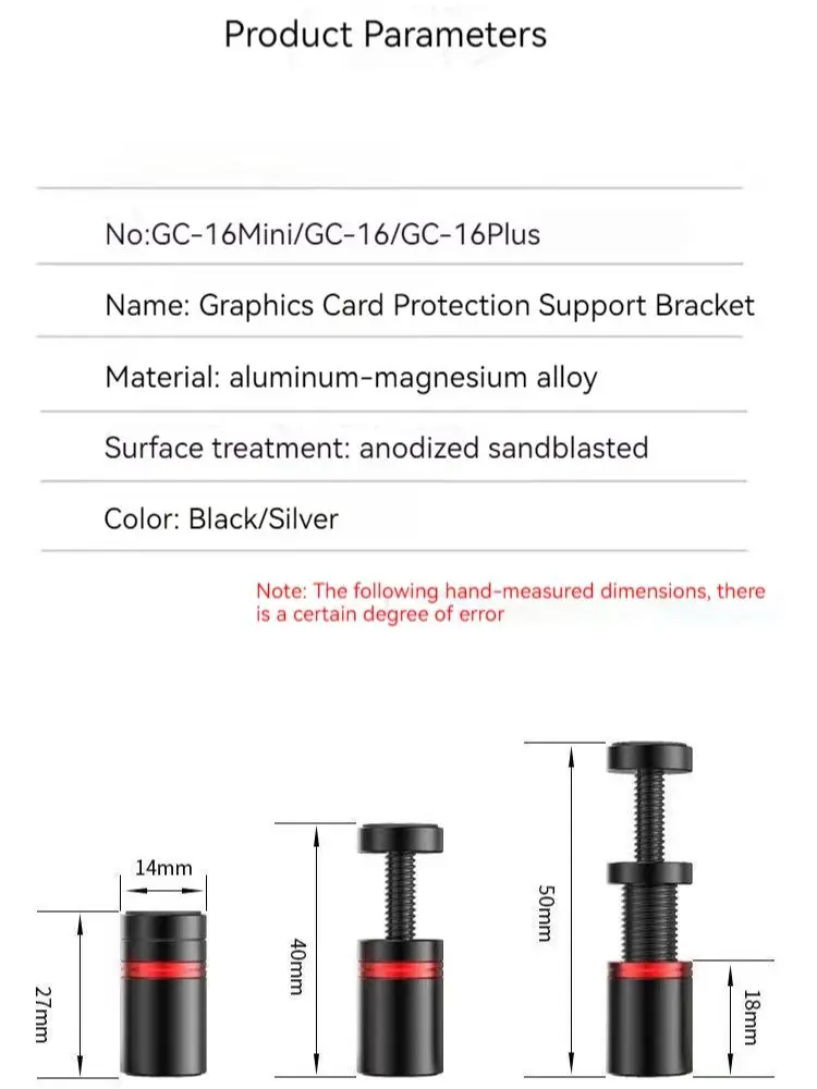 Experience a new level of confidence with the this TEUCER GC-16 Graphics Card GPU Holder, crafted to provide sturdy vertical support for your video cards. Made from durable aluminum, it combines strength with a modern aesthetic—all while maintaining a lightweight profile of just 50 grams. Its magnetic design allows easy installation, while the telescopic structure adjusts seamlessly to support GPUs ranging from 27mm to 120mm in height. The three available models—GC-16, GC-16 MINI, and GC-16 PLUS—offer versatile options for different card sizes, promising a perfect fit for your setup. With its sleek matte black finish and vibrant red accents, this holder not only stabilizes your graphics card but also adds a striking touch to your build.