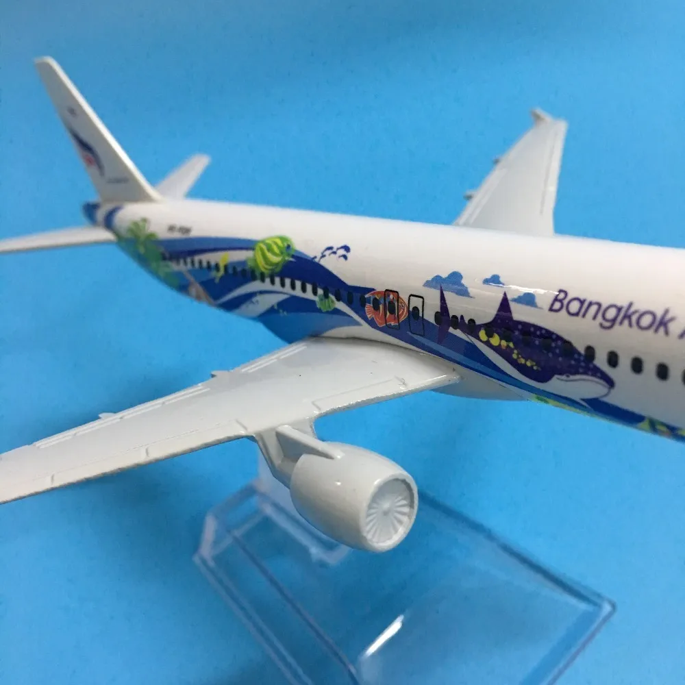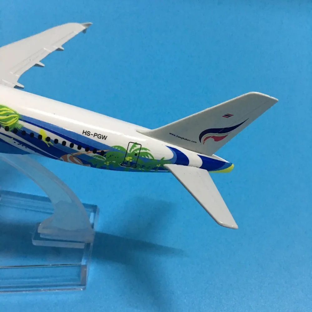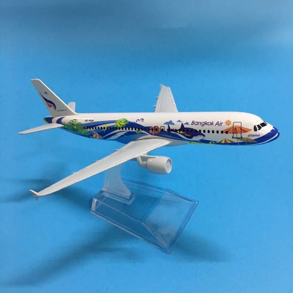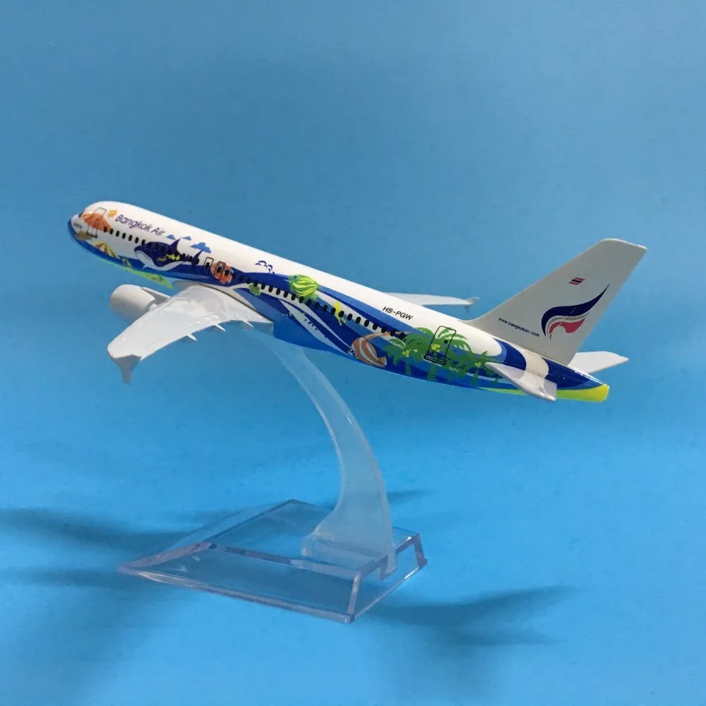 Experience the vibrant realism of this 16cm diecast metal model of a Thai Bangkok Air Airbus A320 at a 1:400 scale, crafted from durable alloy with detailed colorful graphics featuring tropical scenes, palm trees, and waves. The sleek fuselage displays the airline’s branding with a stylized tail fin in purple and pink, capturing both authenticity and artistic flair. Measuring approximately 160mm from nose to tail and 140mm across the wingtips, this collectible is ideal for aviation enthusiasts and décor lovers alike. Lightweight, CE certified, and suitable for ages 14 and above, it includes a sturdy plastic holder and an elegant display box.