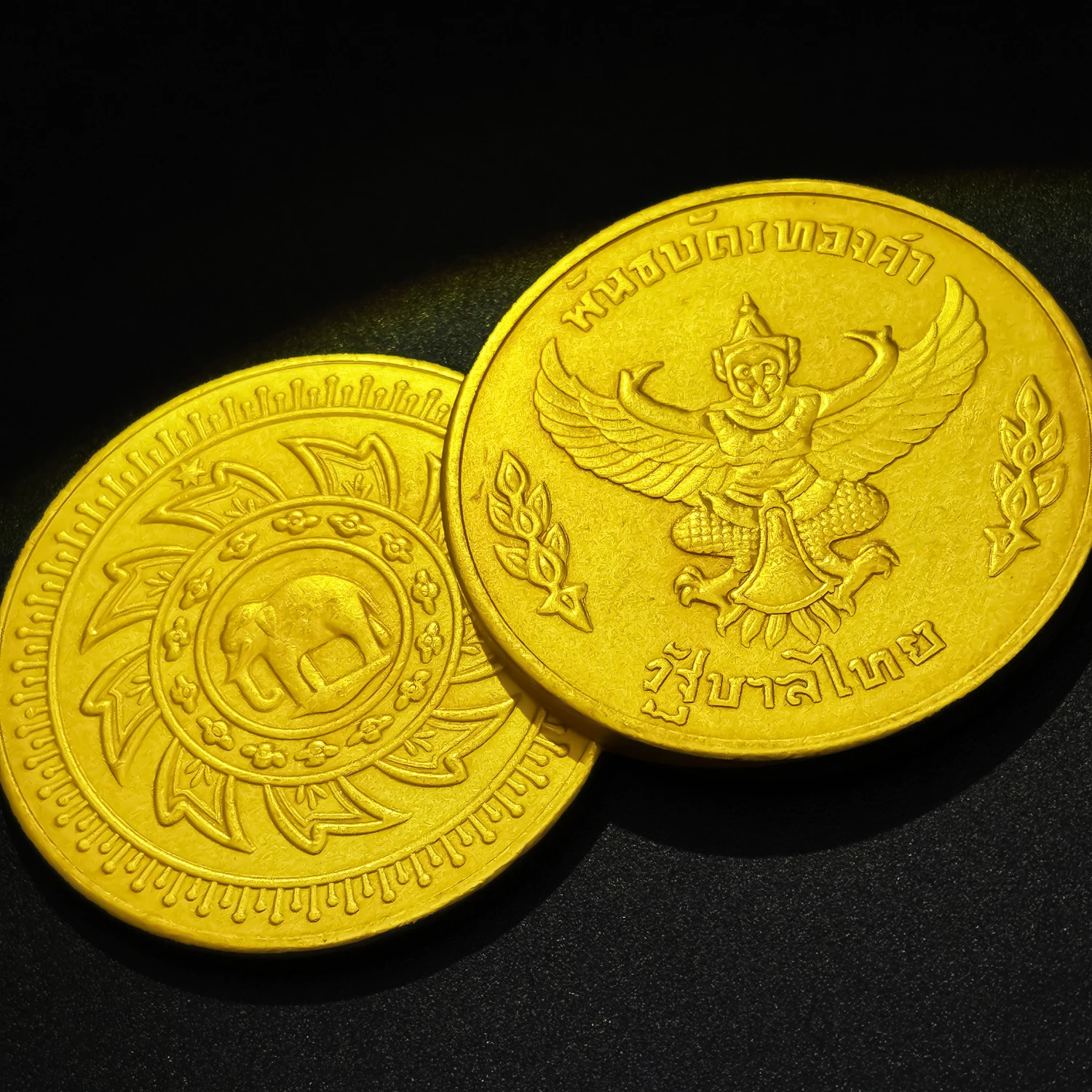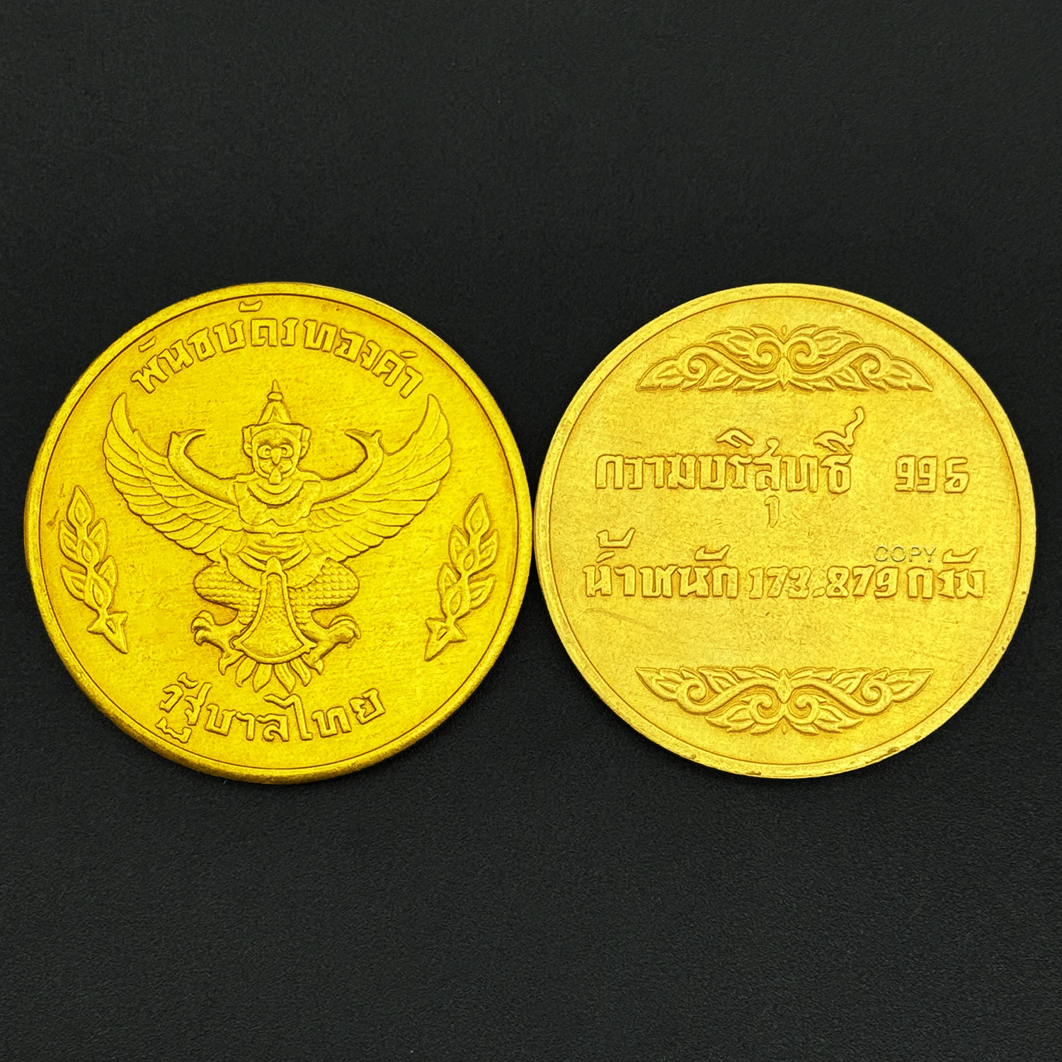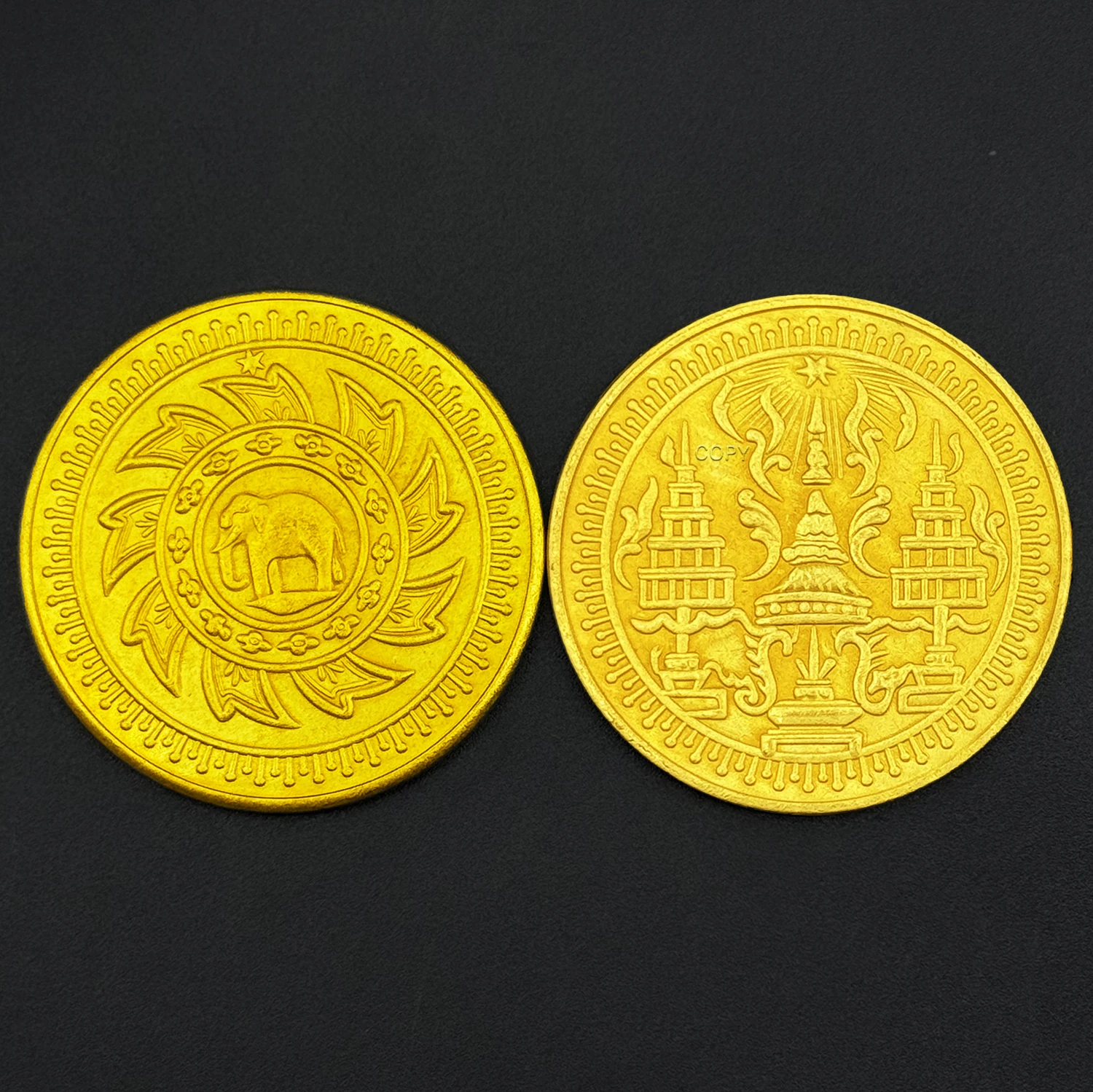 Immerse yourself in Thailand’s rich cultural heritage with this beautiful set of handcrafted copper replicas. Measuring approximately 30mm in diameter, these pieces showcase intricate embossed designs that reflect traditional artistry. The first features a detailed elephant motif surrounded by floral patterns, symbolizing wisdom and strength. The second displays a majestic Garuda figure with exquisite feather and body details, accompanied by Thai inscriptions that evoke national pride. Crafted from durable copper with a polished, shiny finish, their warm, golden hue mimics real gold, giving them a vintage, antique appeal. Perfect for home decor, collections, or meaningful gifts, these replicas bring cultural elegance into your space and create a sense of connection with Thai history and artistry.