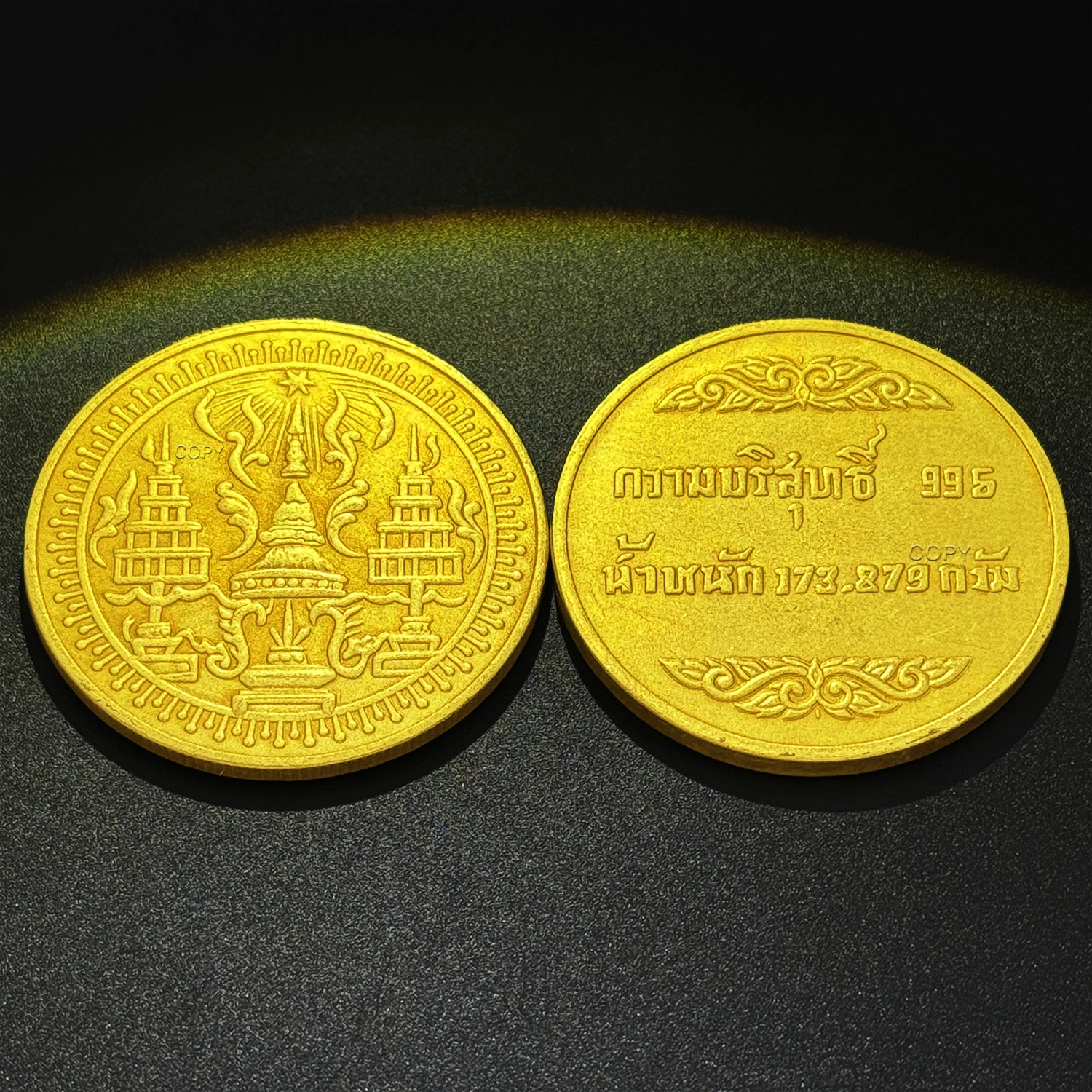 - Includes two handcrafted copper replicas: one of King Rama IV (1864) and one of Thai Baht (1951), each approximately 30mm in diameter with intricate embossed motifs.