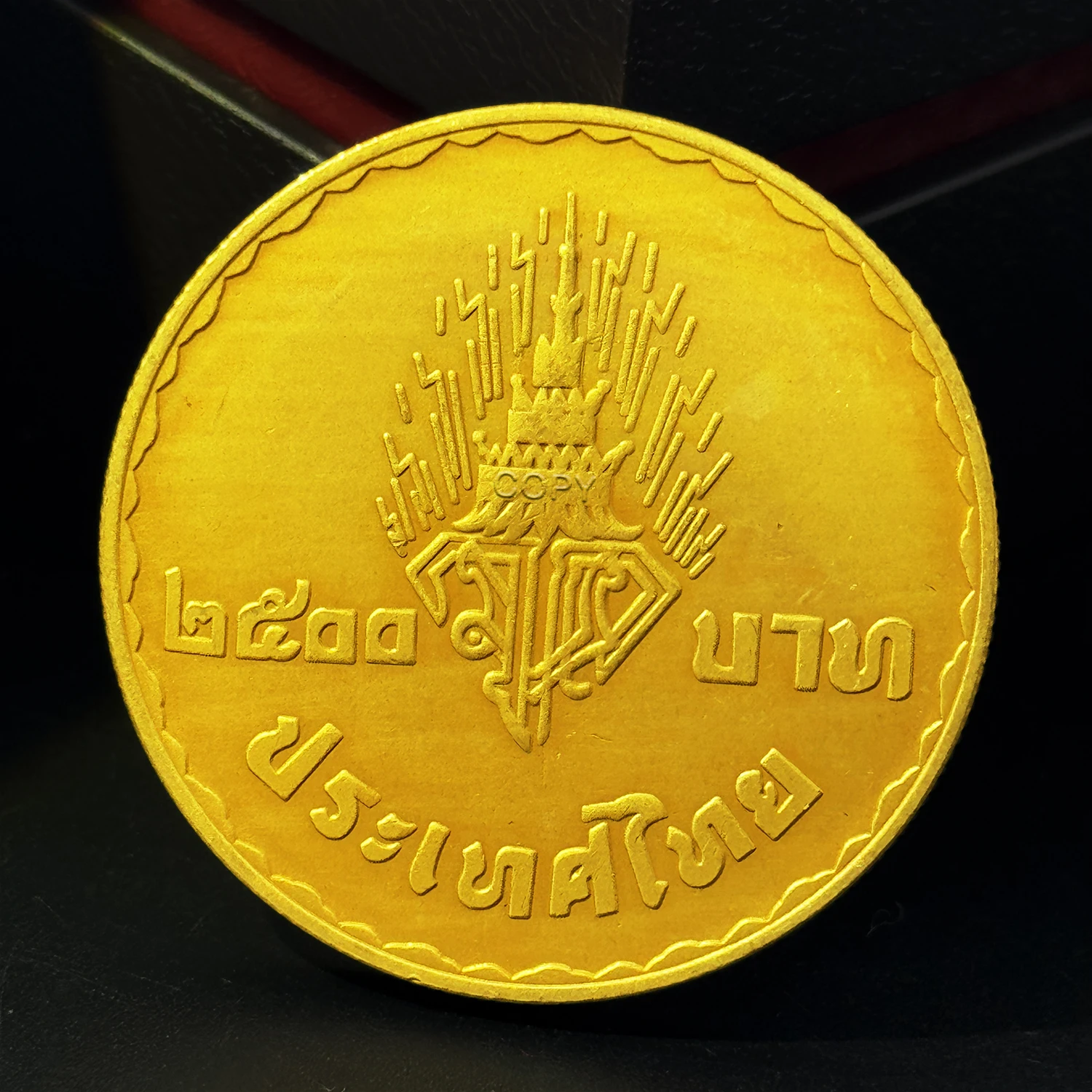 - Surrounded by embossed Thai script around the circumference, complemented by decorative symbols such as gears or caduceus, emphasizing patriotic symbolism and historical significance.