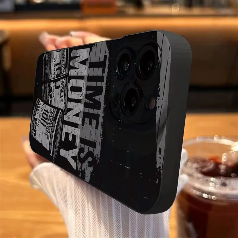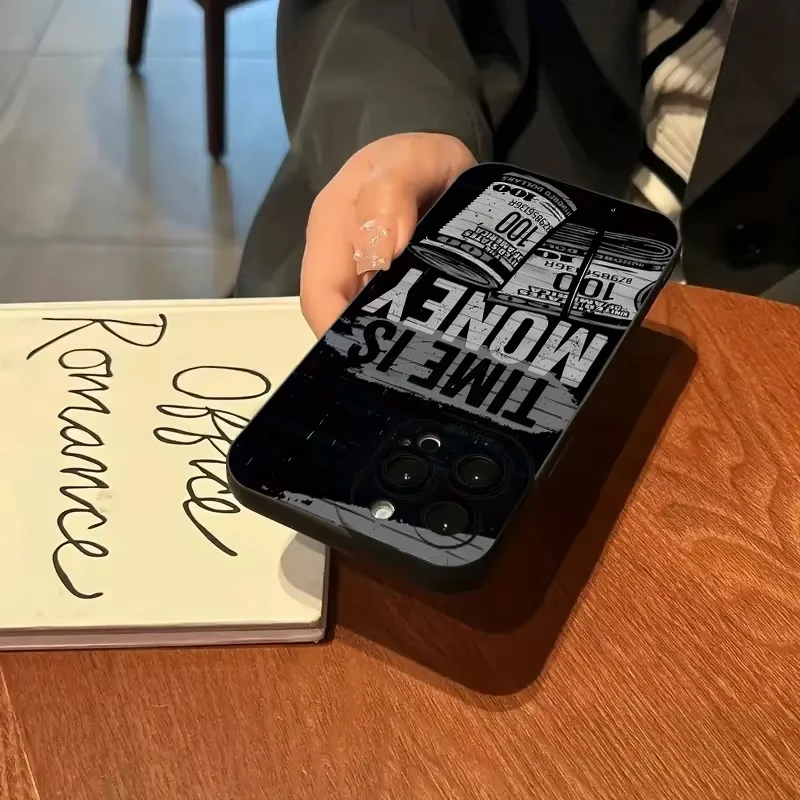 - The case's aesthetic design includes a bold graphic with “TIME IS MONEY,” layered over a smoky background for an intense, captivating appearance.