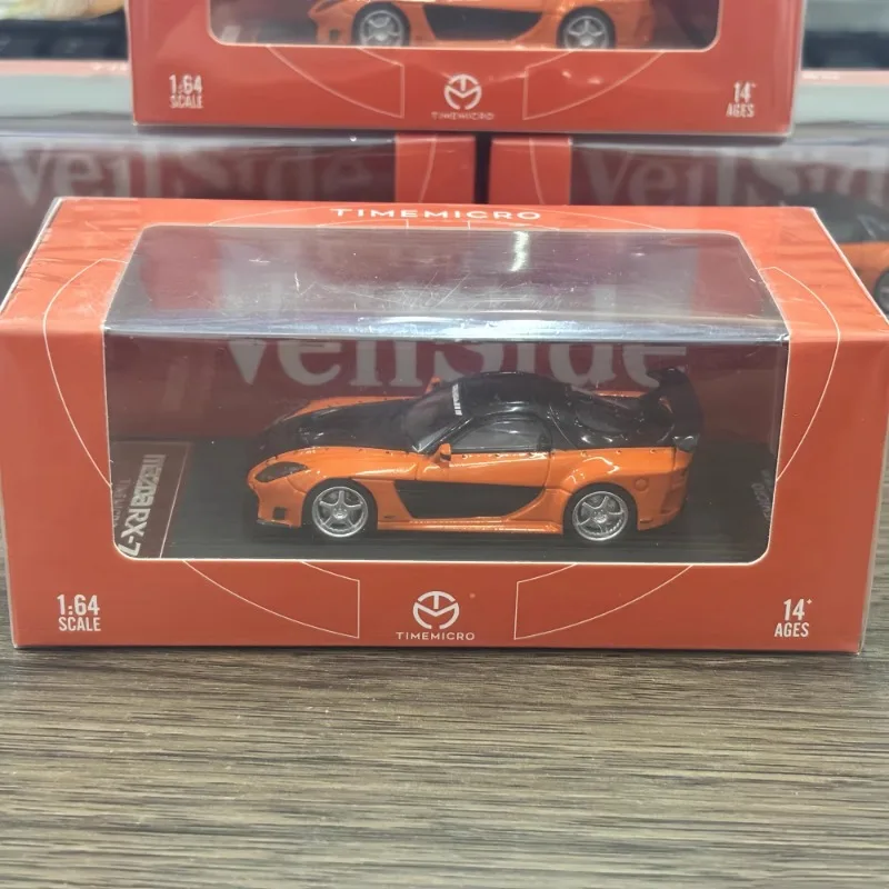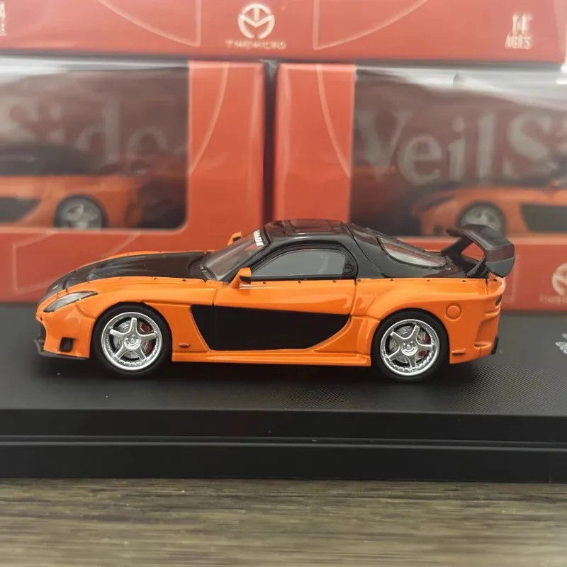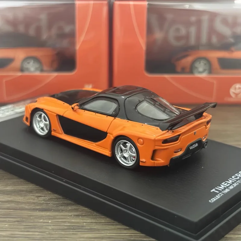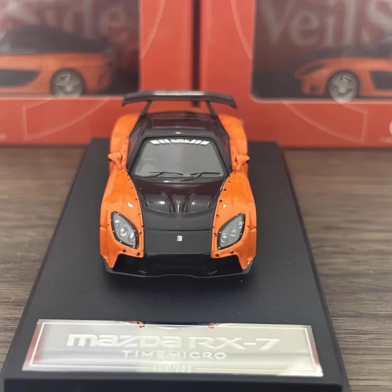 The TimeMicro Diecast 1/64 Scale Mazda Veilside RX7 Racing Toy Car Model captures the essence of racing in a beautifully detailed miniature. With its vibrant orange body and sleek black accents, this diecast model perfectly highlights the aerodynamic lines and curves that define a true supercar. The chrome-finished metal alloy wheels paired with low-profile tires elevate its racing aesthetic, while the detailed front grille and headlights enhance realism. A prominent rear wing adds dynamics to the design, suggesting stability for high-speed pursuits. Complete with clear plastic windows that reveal an intricate dashboard, this model is a must-have for collectors and enthusiasts alike.