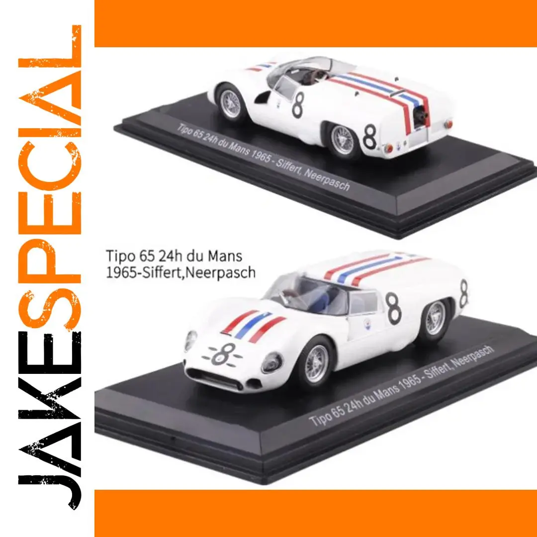 Bring home the allure of racing history with the finely crafted 1:43 scale model of the Tipo 65 sports car, famously associated with the 1965 24 Hours of Le Mans. This striking model showcases a sleek white body accentuated by vibrant blue and red racing stripes, complete with the number “8 inches displayed prominently on both sides. The attention to detail is evident in its wire-spoked wheels and visible cockpit area, making it a true collector’s piece. Mounted on a black display base, this diecast model is perfect for enthusiasts who appreciate the craftsmanship and legacy of classic racing cars.