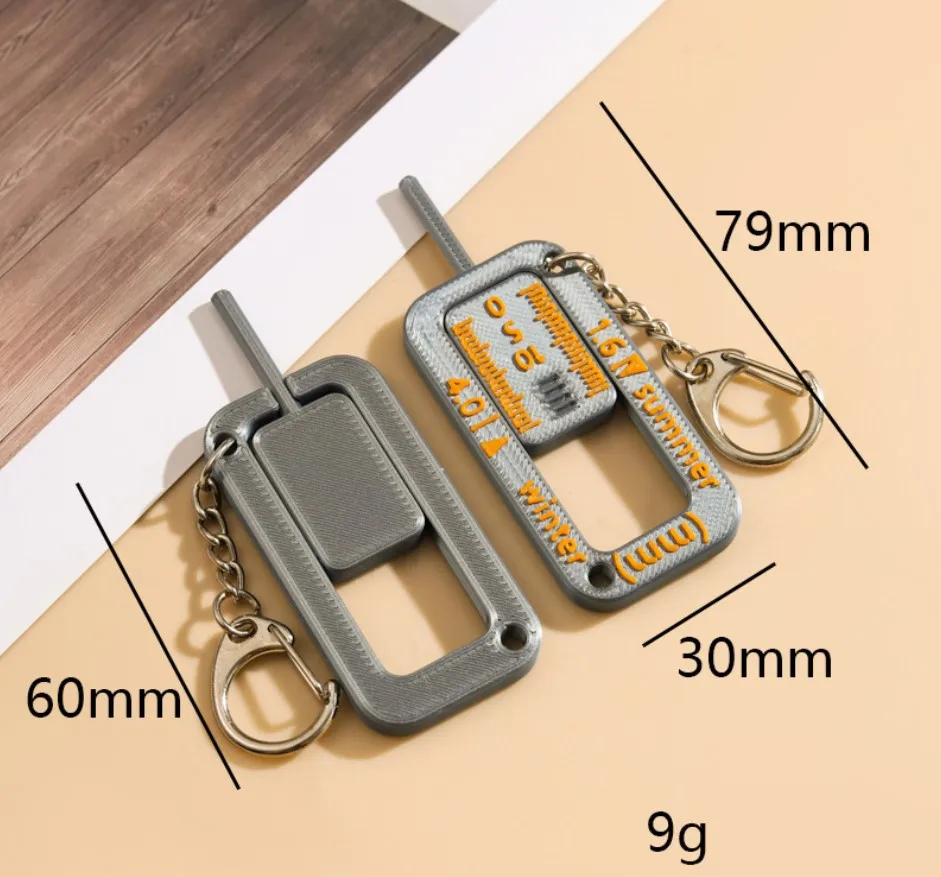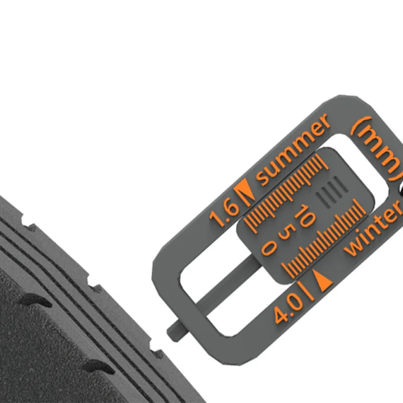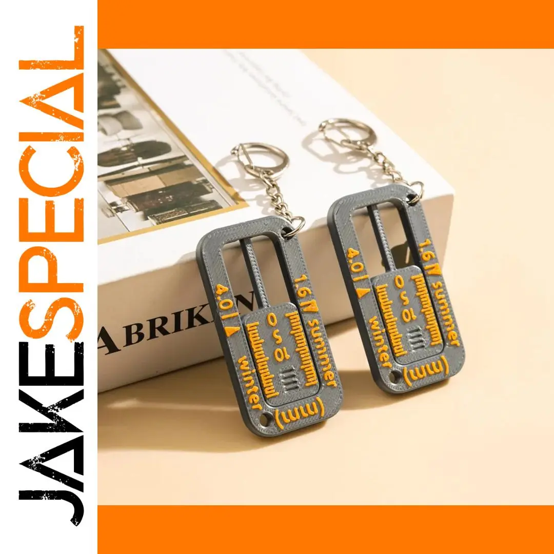 Enhance your style with this trendy tire depth gauge keychain crafted from zinc alloy with a luxurious gold-color and rhodium finish. Measuring approximately 3 cm in diameter, the round pendant features a textured matte gray surface complemented by vibrant orange and yellow measurement markings, mimicking a tire tread measurement tool for a sporty, casual look. The engraved depth scale with small raised lines and numbers adds a functional, technical appeal, while the silver-colored O-shaped buckle ensures easy attachment to keys or bags. Perfect as a fashionable accessory or gift, this unisex piece beautifully combines practicality with modern design, making it an eye-catching addition to your everyday essentials.