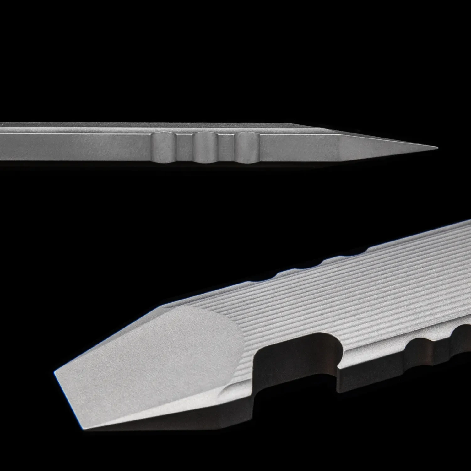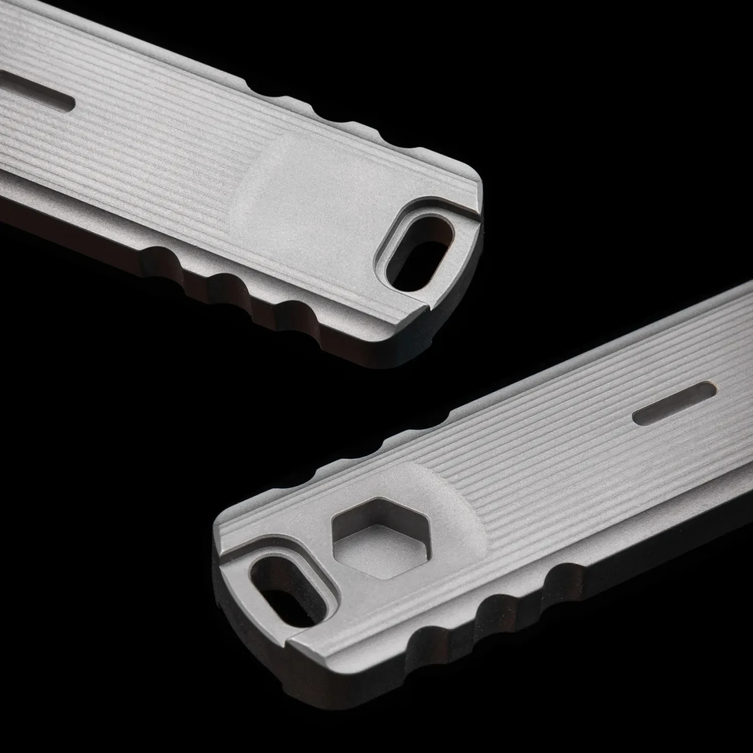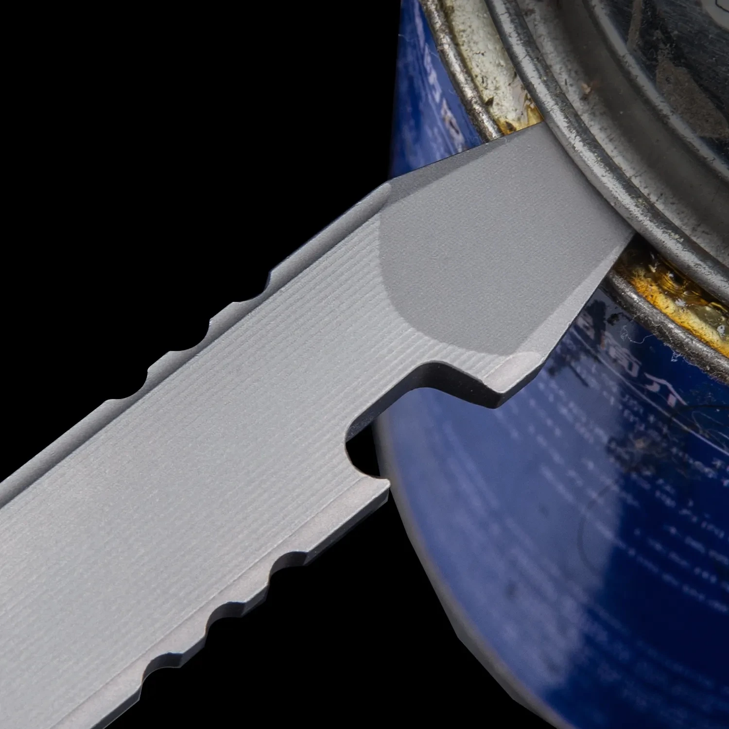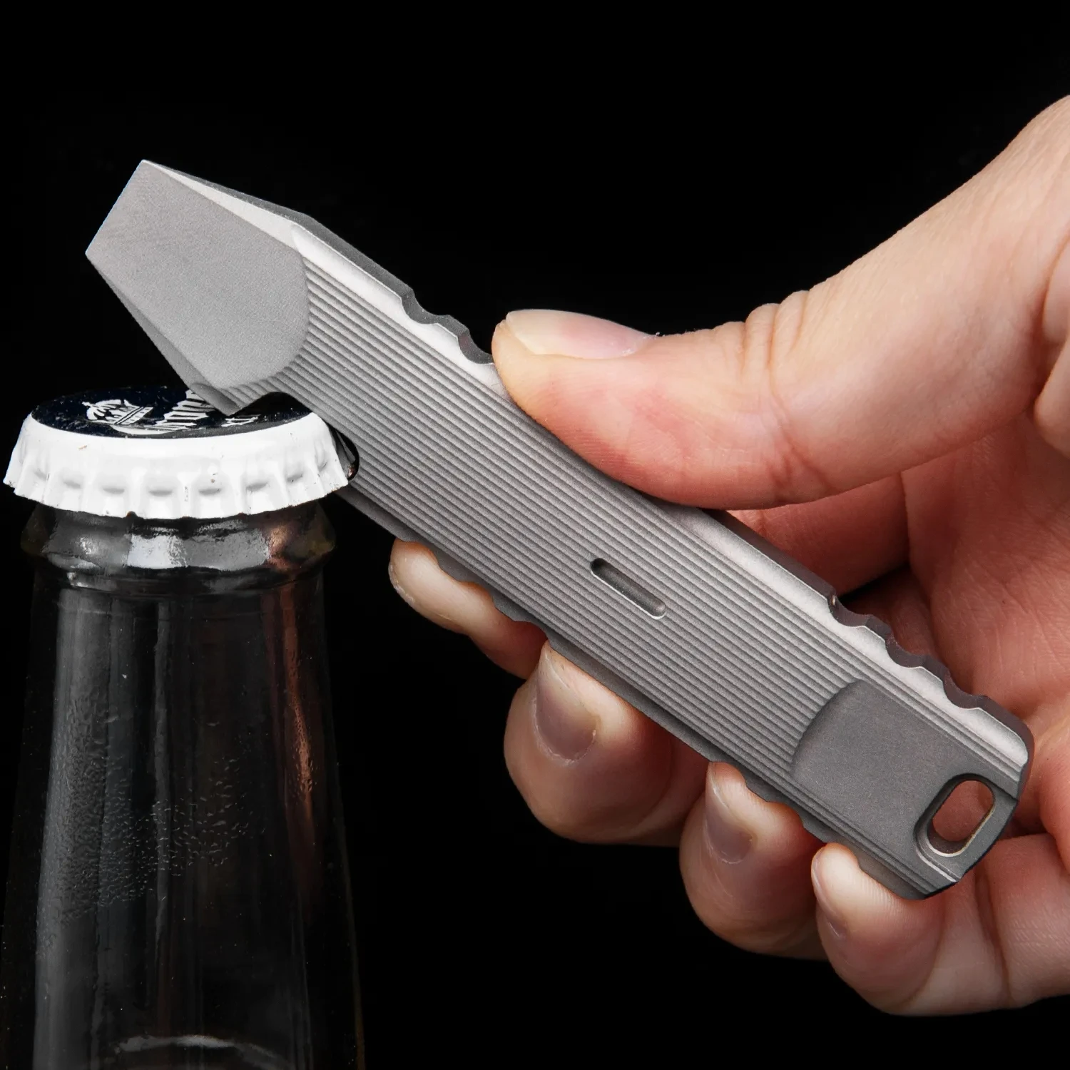 - Technical specifications include: Total length – 9.4 cm; Material – Titanium alloy; Surface finish – shiny metallic; Components – pry bar, bottle opener, nail pry part; Designed for outdoor, camping, or emergency use.
