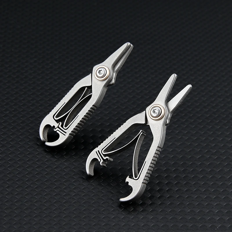 - Technical specifications include: fully titanium alloy construction, laser-cut blades, snap-lock mechanism, handle with textured grip, and compact size designed for portability and precision tasks.