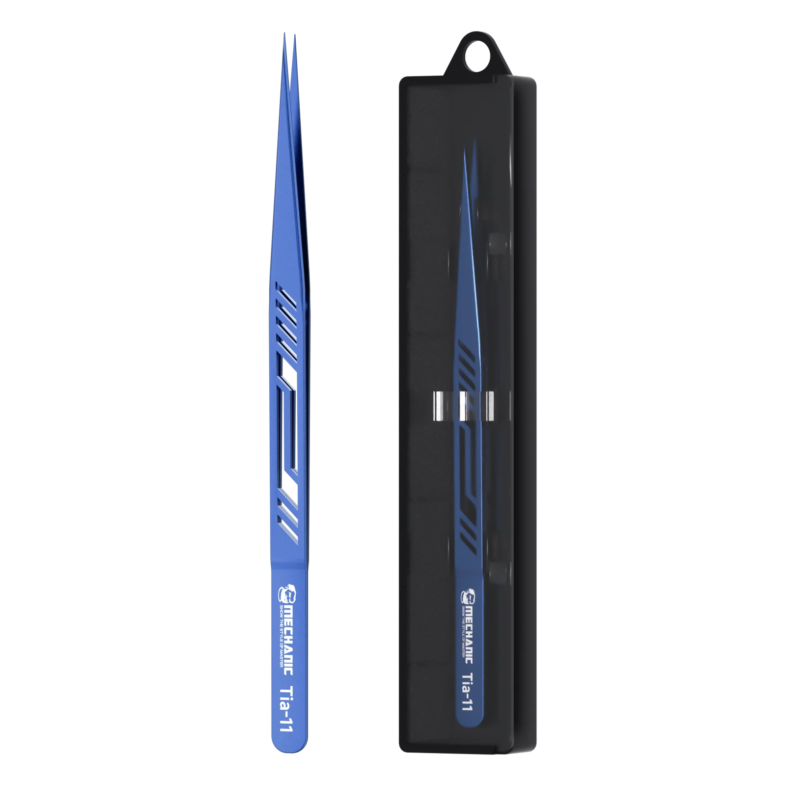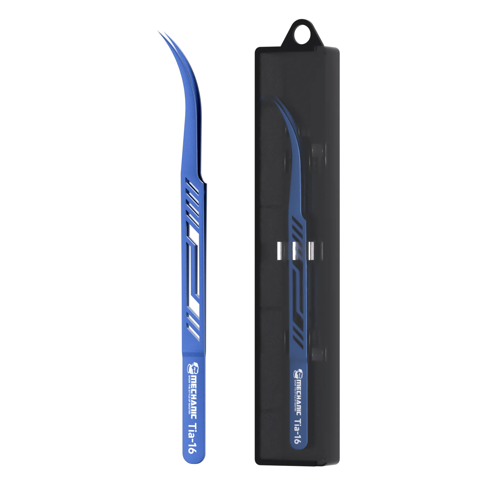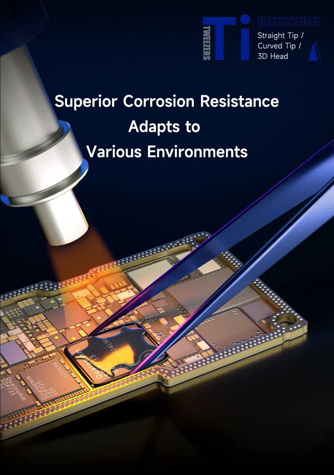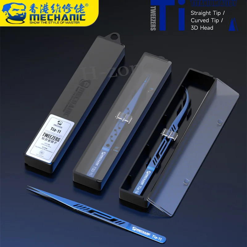 Experience exceptional precision with these titanium alloy tweezers, measuring 155 x 12 x 7 mm, available in models T3D-11, Tia-11, and Tia-16. Crafted from high-strength, corrosion-resistant titanium alloy, they weigh only 10 grams with a gross weight of 44 grams. Designed for electronic assembly, chip repair, and delicate maintenance, they feature straight, curved, and 3D tips, including a 45° curved tip for precise flywire work under microscopes. Their sleek, ergonomic design with polished surfaces and subtle grip grooves ensures durability, control, and comfort during demanding tasks in various environments. Ideal for mobile phone disassembly, chip replacement, and microsoldering.