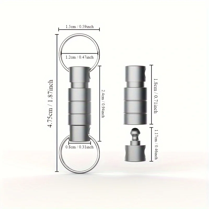 Experience the perfect blend of durability and sleek design with this titanium alloy quick release keyring. Crafted from high-quality titanium steel, it offers exceptional strength while maintaining a lightweight form factor. The matte silver finish enhances its modern industrial look, making it ideal for outdoor enthusiasts and everyday carry (EDC) lovers. Its compact, cylindrical shape features subtle tapering and horizontal grooves для enhanced grip. The spring-loaded locking mechanism ensures secure attachment and effortless release, providing you peace of mind during daily use. With included stainless steel keyrings, this tool is versatile and customizable, perfect for DIY projects. Elevate your key organization with this reliable, high-performance accessory created for durability and style.