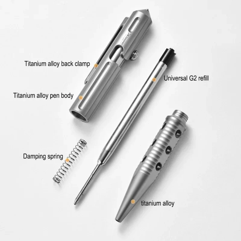Experience the perfect blend of style, strength, and functionality with this high-quality titanium alloy tactical pen. Measuring 129mm in length and 12mm in diameter, it boasts a robust titanium-steel construction designed for daily writing, personal defense, and emergency glass-breaking. The pen’s artistic finish options include a mesmerizing iridescent, colorful glaze, a sleek dull polish, or a semi-glossy metallic gray, appealing to different tastes. Its textured design features ergonomic grooves for a secure grip and drilled holes for aesthetic appeal and weight reduction. Equipped with a replaceable G2 refill, this versatile tool seamlessly transitions from an office signature pen to a tactical companion whenever needed. It’s your reliable, stylish, multi-purpose writing and self-defense accessory.