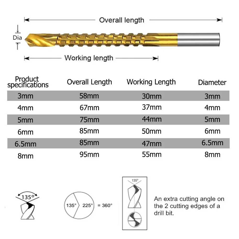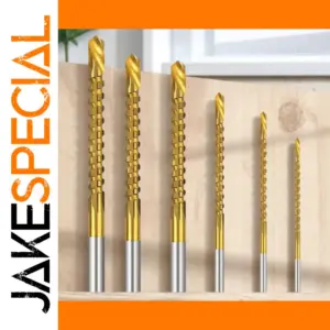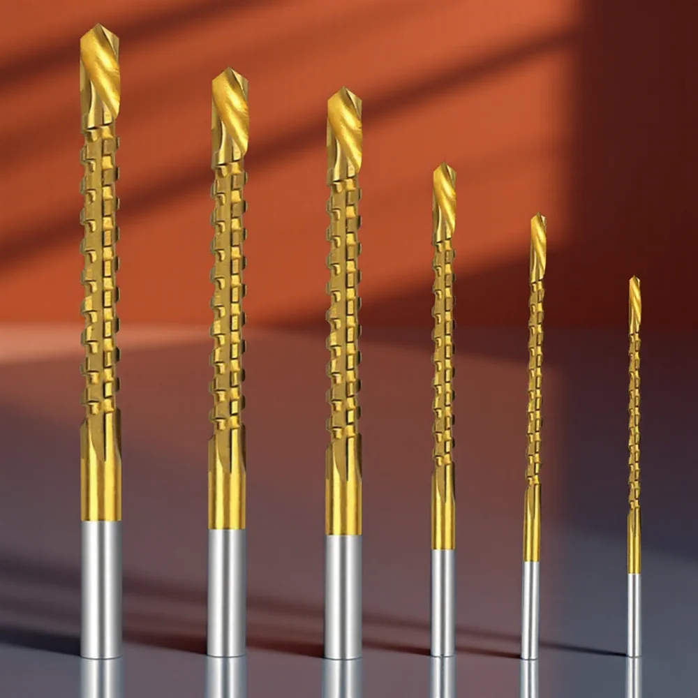 Achieve precise and efficient drilling with this set of six titanium-coated spiral saw drill bits in 3mm, 4mm, 5mm, 6mm, 6.5mm, and 8mm sizes. Crafted from high-speed steel with a durable titanium finish, each bit features a fully ground spiral groove and a 135-degree split point for fast, walk-free drilling on wood, plastic, aluminum alloy, and softer metals. These versatile bits perform drilling, grooving, and surface sawing, with sharp edges and serrated centers for sustained horizontal cutting. Packaged in a convenient plastic case, they are compatible with most power drills and ideal for woodworking and metalworking projects.
