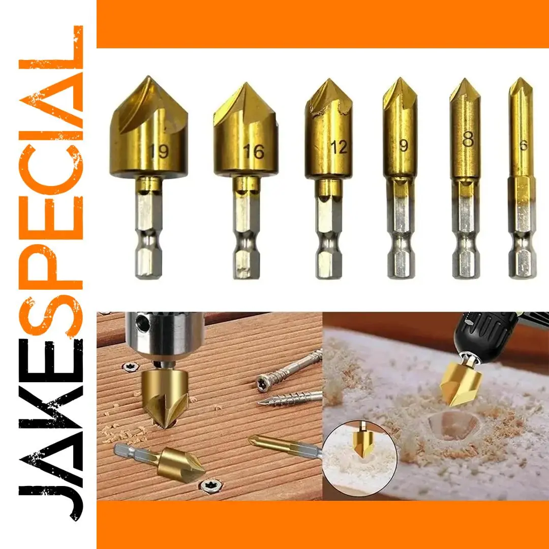 Enhance your woodworking projects with this 6-piece set of core drill bits, ranging from 6mm to 19mm in diameter, featuring a durable high carbon steel construction. Each bit has a sleek, hexagon handle for easy grip and compatibility with power drills. The gold-colored titanium plating not only provides corrosion resistance but also adds a stylish touch. Designed with a five-edge chamfering and countersunk conical head, these bits produce clean, precise spot faces and countersinks for fasteners and joinery. Perfect for professionals and enthusiasts alike, this set offers reliable performance and excellent control for detailed woodwork applications.