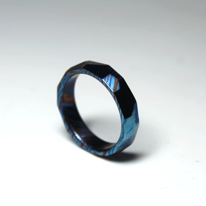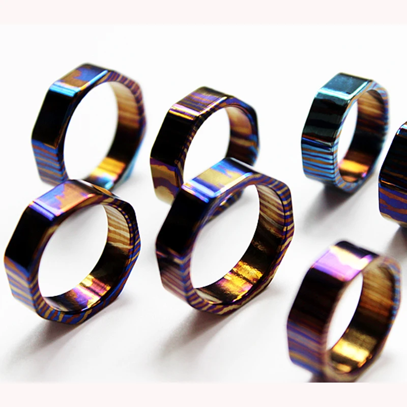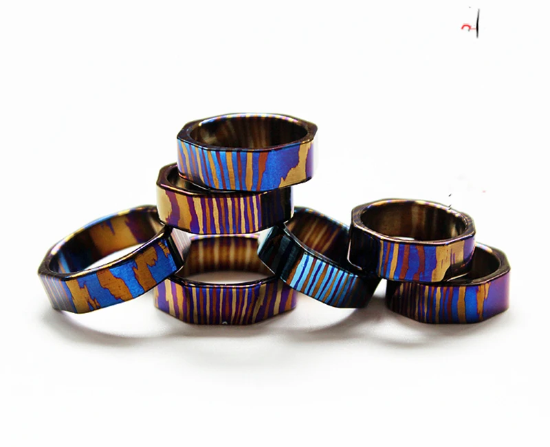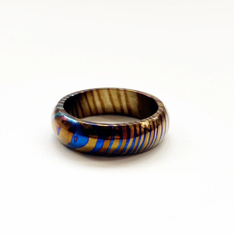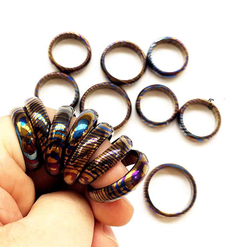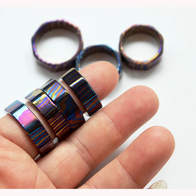Imagine wearing a jewelry piece that exudes both art and strength, elevating your style with a luxurious yet rugged appeal. This exquisite titanium alloy ring pendant features a mesmerizing Damascus pattern crafted from solid tri-color titanium, showcasing an iridescent mix of gold, blue, purple, and black hues. Its irregular crystal surface reflects meticulous craftsmanship—carefully polished, baked, and resistant to scratches and wear for lasting beauty. The rounded, smooth profile guarantees comfort, while the unique textured surface offers an intriguing visual depth. Ideal for enthusiasts seeking a distinctive accessory, this piece can be custom-sized with inner diameters of 18mm, 20mm, or 22mm, adapting seamlessly to your personal style or collection. Own a wearable masterpiece that combines durability, art, and personalization.