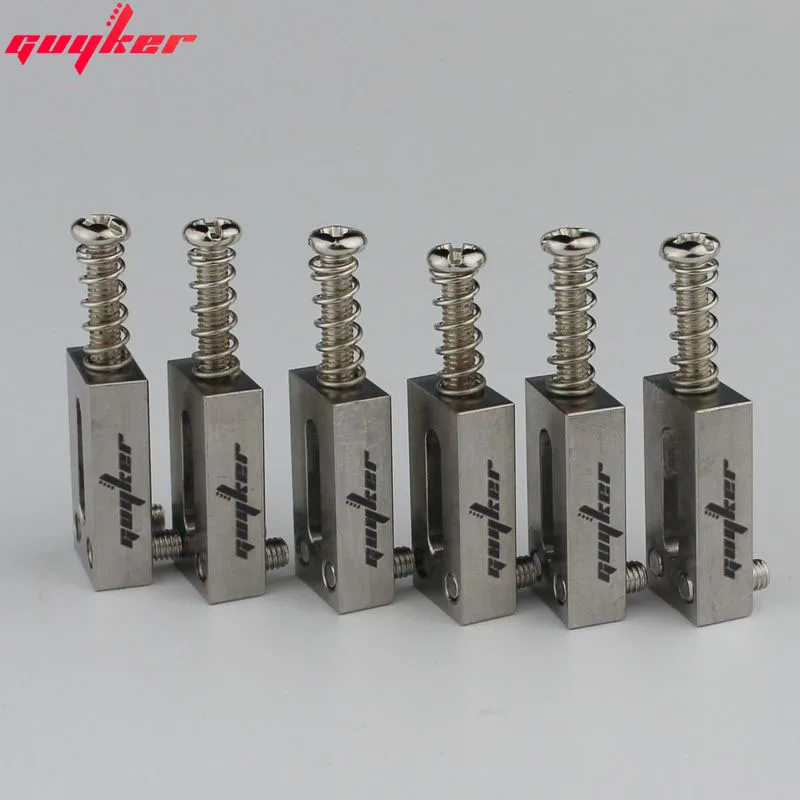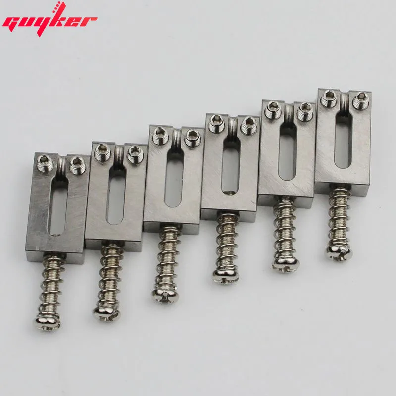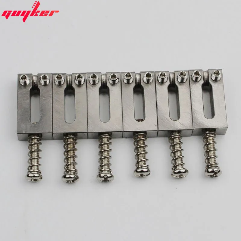Upgrade your electric guitar’s tone with this premium set of titanium alloy bridge saddles. Crafted for Strat-style tremolo or fixed bridges, these six saddles boast a sleek, polished silver-gray finish that exudes durability and modern sophistication. The carefully designed elongated slots provide a smooth string guide, enhancing tuning stability and sustain. Each saddle features small precision screws on top, allowing easy height adjustments, while side contact points enable precise intonation settings. The inclusion of an adjustable wrench, springs, and screws makes installation straightforward. Elevate your guitar’s performance with these high-quality, textured, durable saddles, and enjoy a sleek, professional look that complements vintage or modern electric guitars alike.