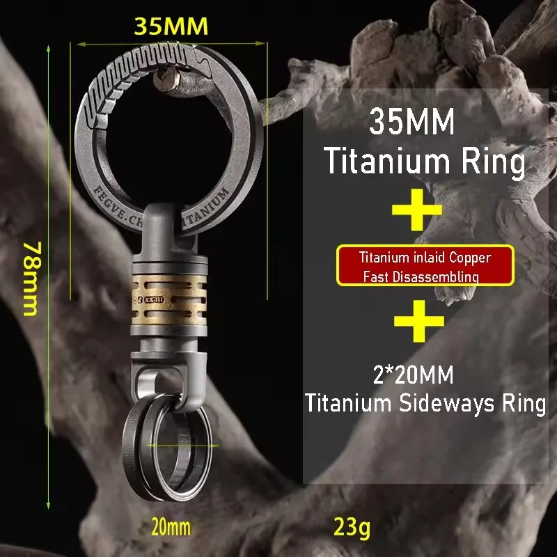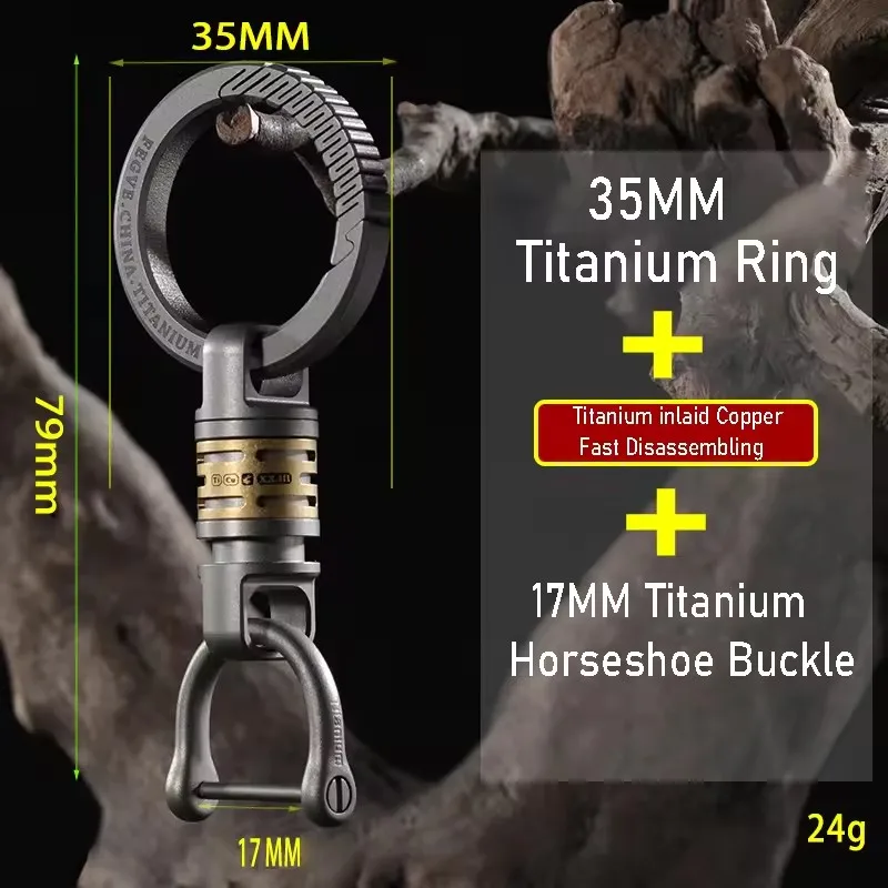 - Technical specifications include titanium alloy construction, 35mm size options, and a split ring for attaching keys or accessories.