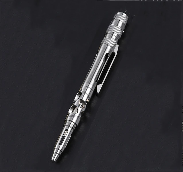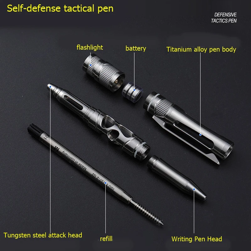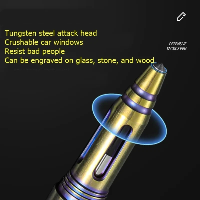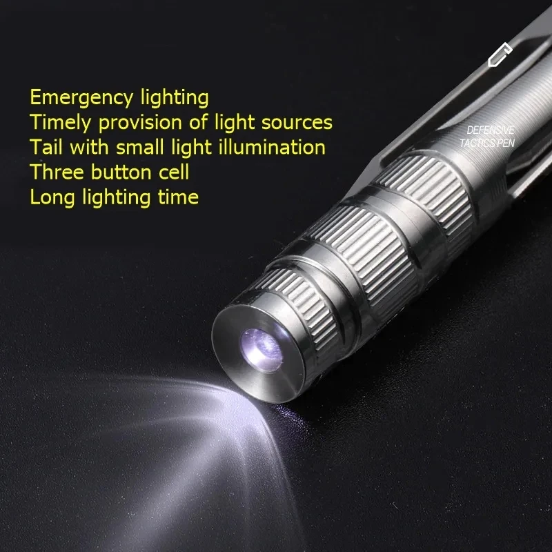 Experience the versatility and durability of this titanium alloy multi-functional pen, measuring 14.2 cm in length with a 1.2 cm diameter and weighing 37 grams. Available in striking Gold Blue and sleek Silver finishes, it combines a high-quality ballpoint pen with essential emergency tools, including a window-breaking tip, self-defense feature, and built-in LED light. Its slim, cylindrical design features textured rings and grooves for enhanced grip and aesthetic appeal, making it an ideal accessory for outdoor, travel, or professional use. Combining practicality with modern style, this tactical pen delivers reliable performance for writing, safety, and illumination in one compact package.