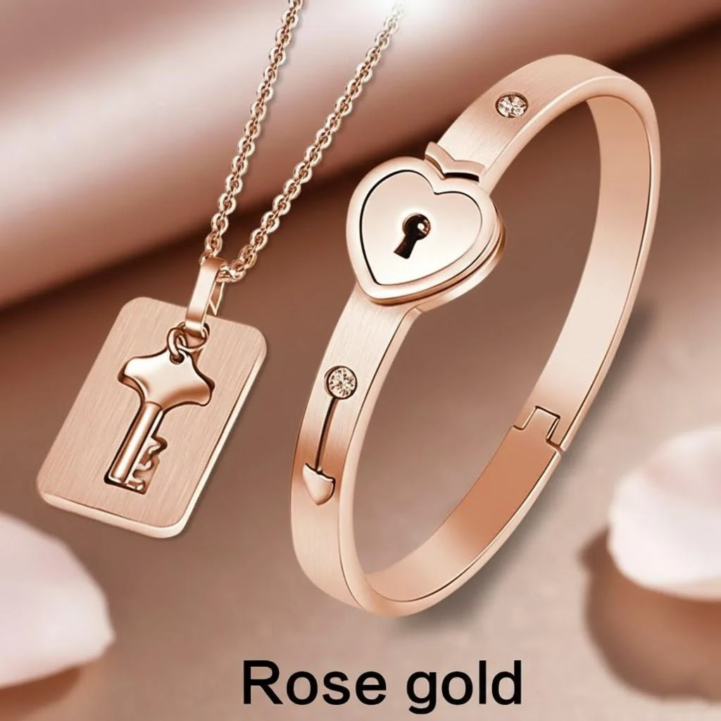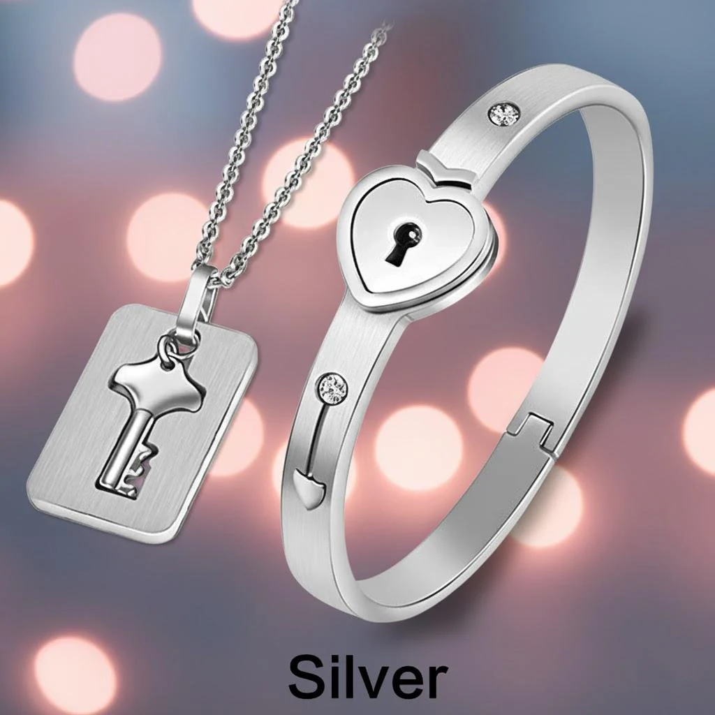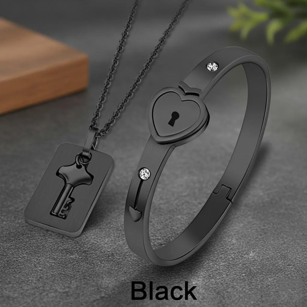 This elegant couple jewelry set features a sleek, hypoallergenic titanium steel lock bracelet with a 2.2-inch diameter, designed for small wrists, and a 19.8-inch delicate chain necklace with a stylized key-shaped pendant. The polished, shiny surface of both pieces offers long-lasting color retention, complemented by embedded rhinestones for added charm. Available in black, gold, rose gold, and silver, the set symbolizes love and connection through its key-and-lock motif. The secure closure mechanism involves aligning and rotating the key 90° clockwise to open, creating a romantic, meaningful accessory perfect for special occasions like Valentine’s Day, anniversaries, or Christmas.