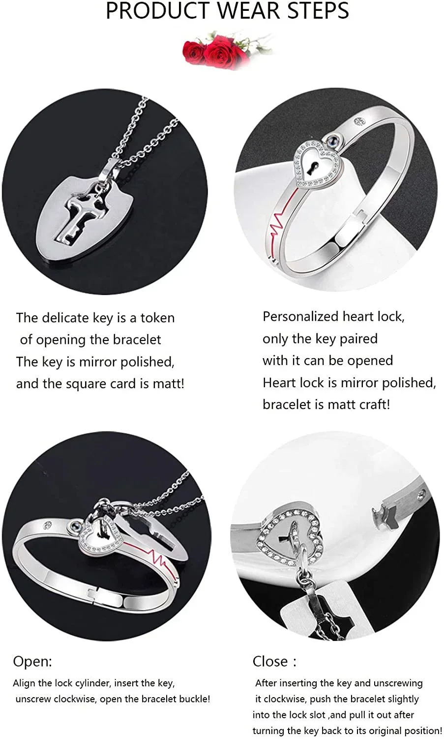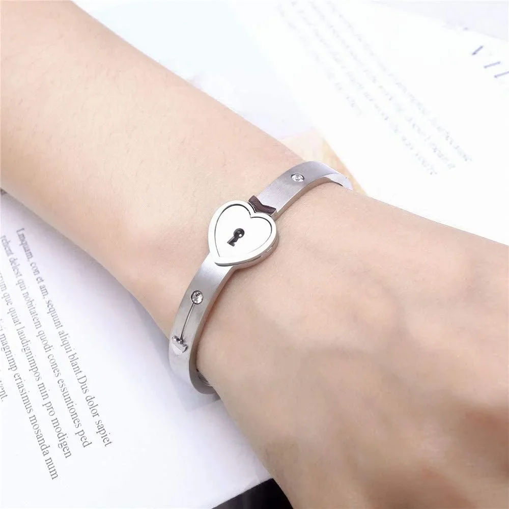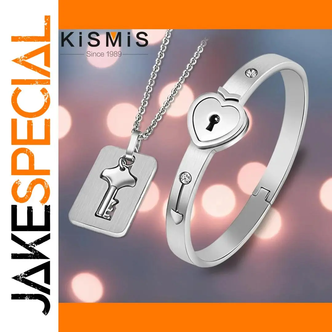 This elegant couple jewelry set features a sleek, hypoallergenic titanium steel lock bracelet with a 2.2-inch diameter, designed for small wrists, and a 19.8-inch delicate chain necklace with a stylized key-shaped pendant. The polished, shiny surface of both pieces offers long-lasting color retention, complemented by embedded rhinestones for added charm. Available in black, gold, rose gold, and silver, the set symbolizes love and connection through its key-and-lock motif. The secure closure mechanism involves aligning and rotating the key 90° clockwise to open, creating a romantic, meaningful accessory perfect for special occasions like Valentine’s Day, anniversaries, or Christmas.