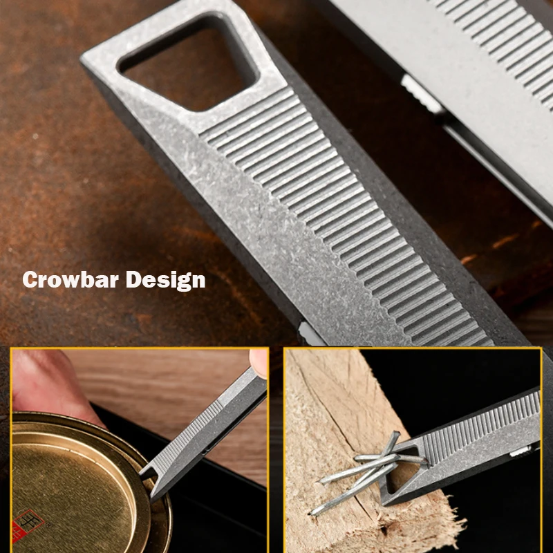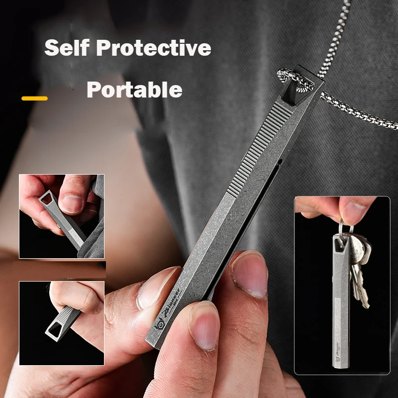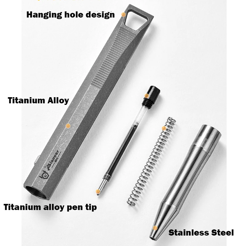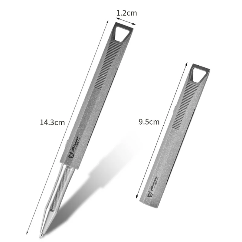 This titanium alloy tactical pen measures 143mm in length and serves as a versatile tool for outdoor survival and emergency situations. It features a sleek, elongated rectangular design with fine parallel ridges on the surface for enhanced grip, available in sandblasted or stone wash finishes for a rugged, modern look. Equipped with a G2 replaceable refill and operated via a push button switch, it functions as a writing instrument, crowbar, nail lifter, self-defense tool, and pendant, making it a compact, durable, and multifunctional accessory for adventurers and outdoor enthusiasts.