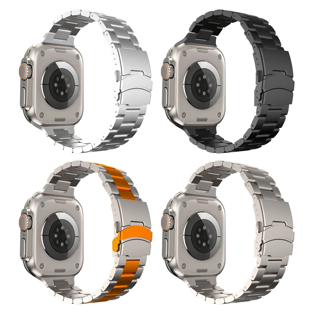 Experience a blend of durability and elegance with this this titanium strap designed specifically for Apple Watch models. Crafted from high-quality titanium, it offers a lightweight yet sturdy feel, perfect for daily wear. The strap features a sleek, modern design with a variety of finishes, including matte black, polished silver, natural titanium, and eye-catching titanium orange. It’s compatible with all Apple Watch sizes—from 38mm to 50mm—covering Series 1 through 10, Ultra, and SE. The adjustable band and titanium clasp ensure a comfortable, secure fit, enhancing your watch’s look while providing high performance. Elevate your style with this versatile, premium-quality watch strap that promises both function and fashion.