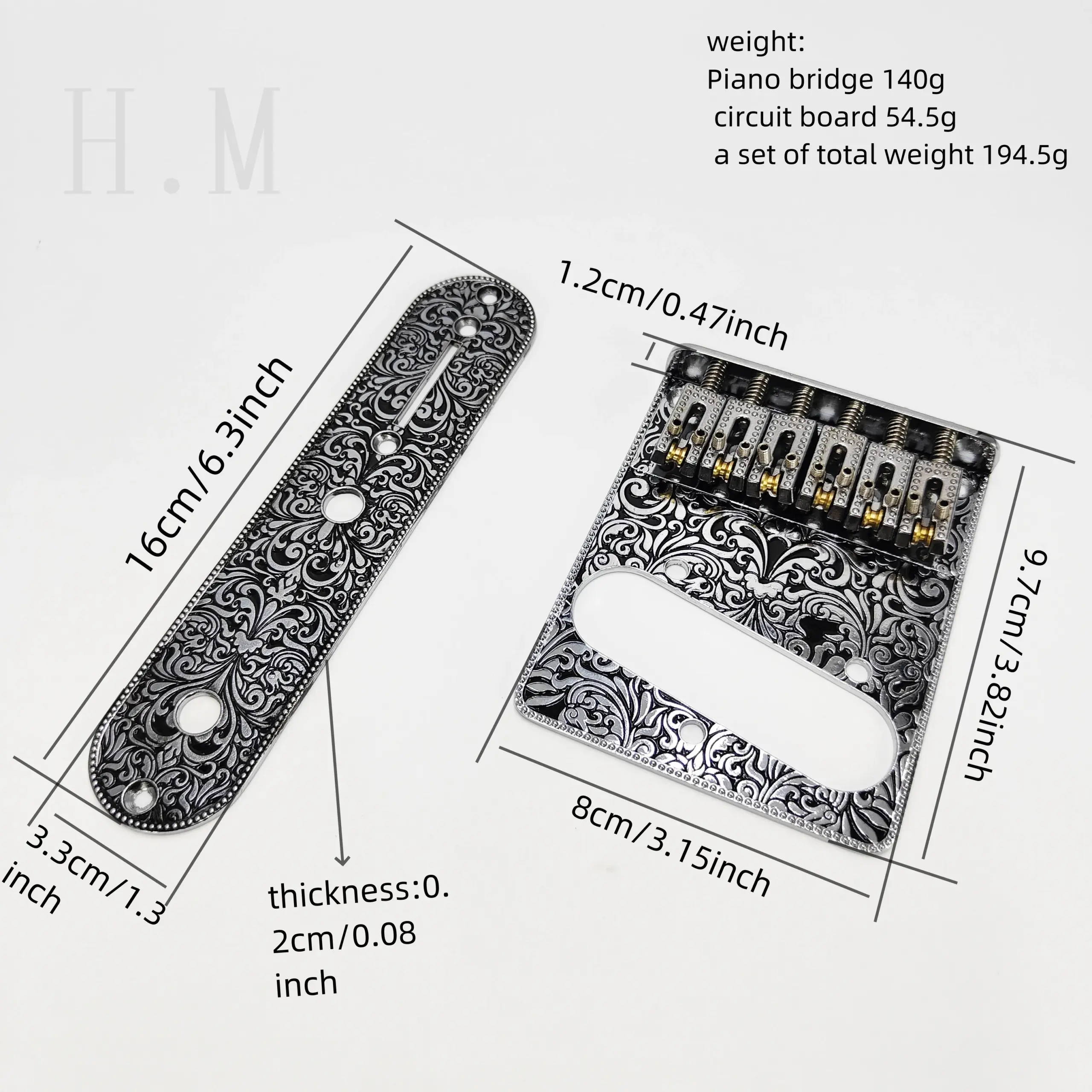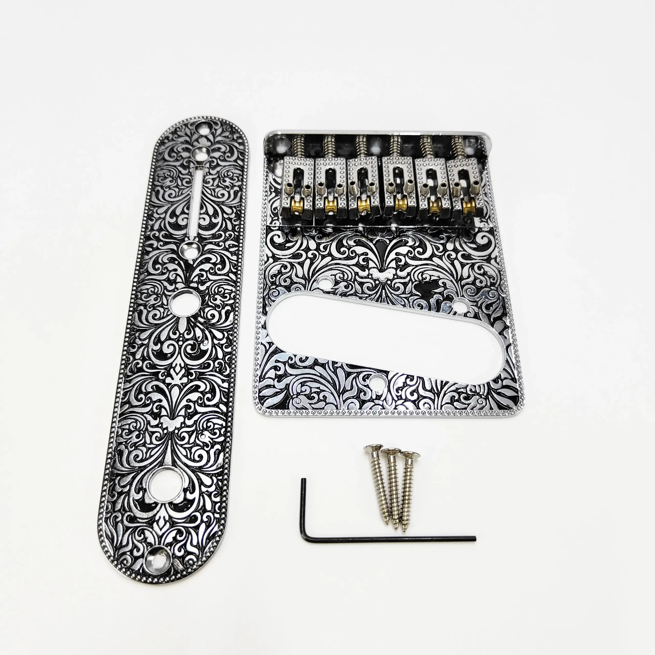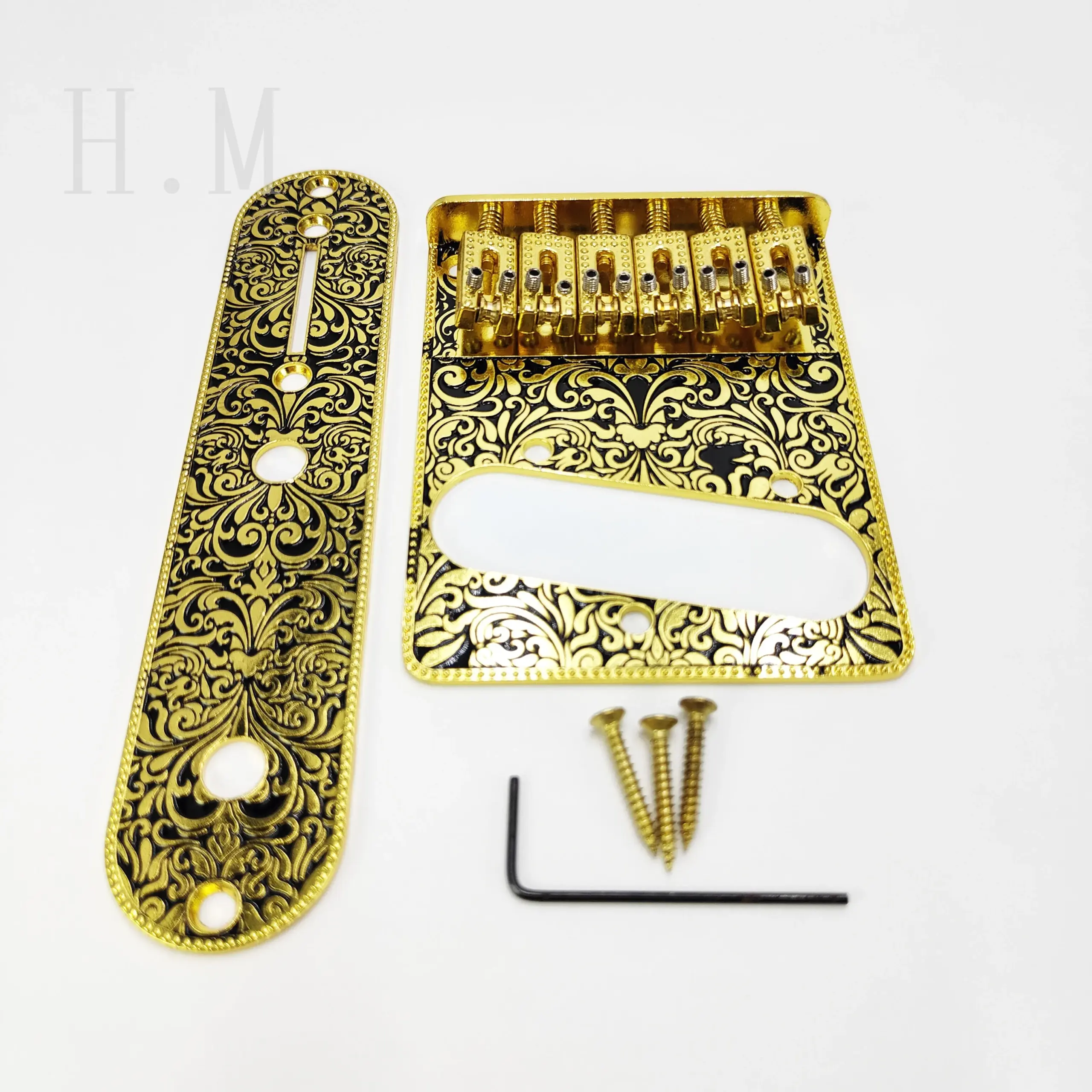 Experience a touch of craftsmanship with this stunning this TL carved ball bridge, expertly crafted from zinc alloy and available in sophisticated gold or silver finishes. Its detailed engravings and elongated design add a vintage charm to your guitar, elevating both appearance and performance. With precise threading options—bottom and back threading—it offers easy installation and exceptional stability. Weighing 128g, the ball string plate delivers balanced acoustics, while the combined weight with the straight plate sums to 190g for robust sustain. The set includes five screws and a custom wrench, ensuring a seamless setup. Designed for durability and style, this component guarantees reliable tone and aesthetic appeal. Perfect for enhancing your guitar’s character and sound quality.