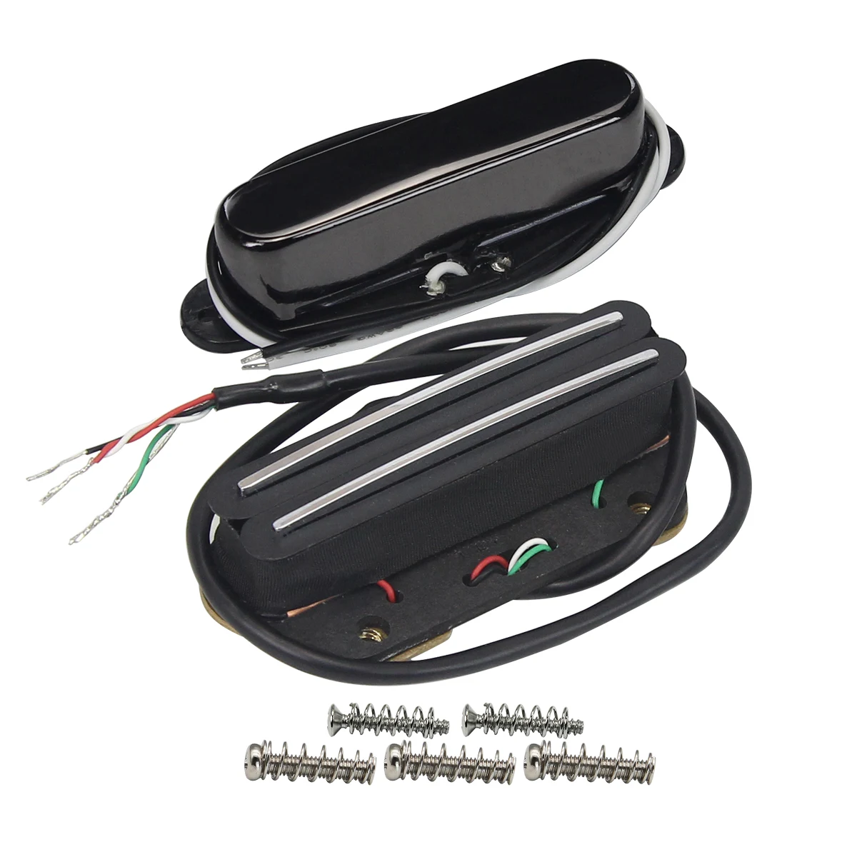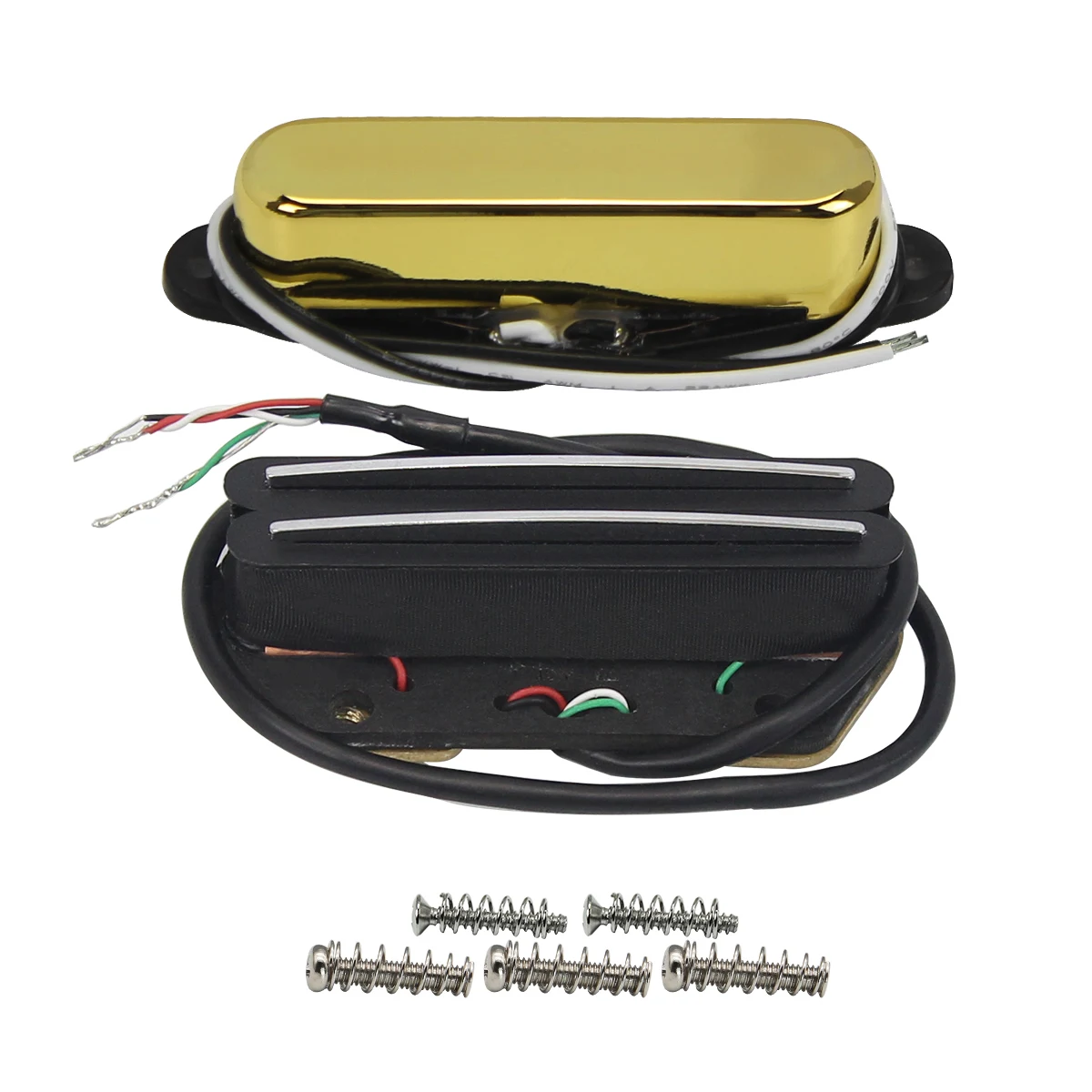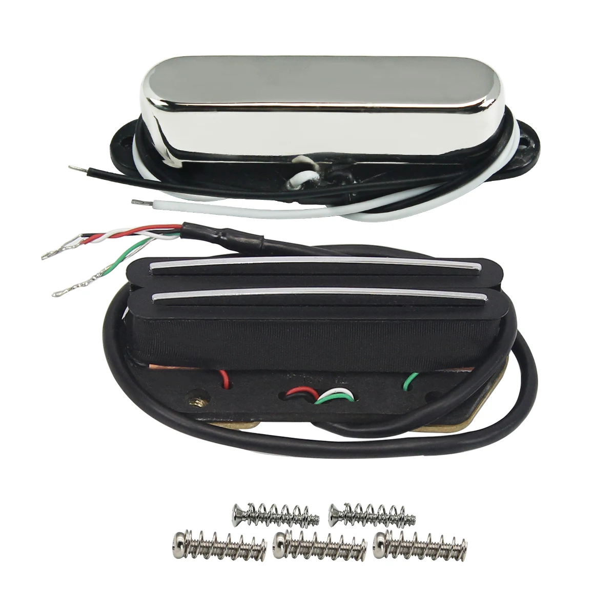 This set features a sleek Alnico 5 neck pickup with a resistance of 7-8kΩ and a modern, polished look, paired with a robust dual rails humbucker bridge pickup with a resistance of 12-13kΩ, featuring a black fiber bobbin and brass base plate for enhanced tone. Fully wax potted for noise reduction, the humbucker includes four wires for coil splitting—white and red for series split, green and bare for ground, black as hot signal—offering versatile sound options. Designed for TL style guitars, these pickups come with mounting screws and springs, available in Black, Gold, and Chrome finishes, elevating your guitar’s performance and aesthetic.