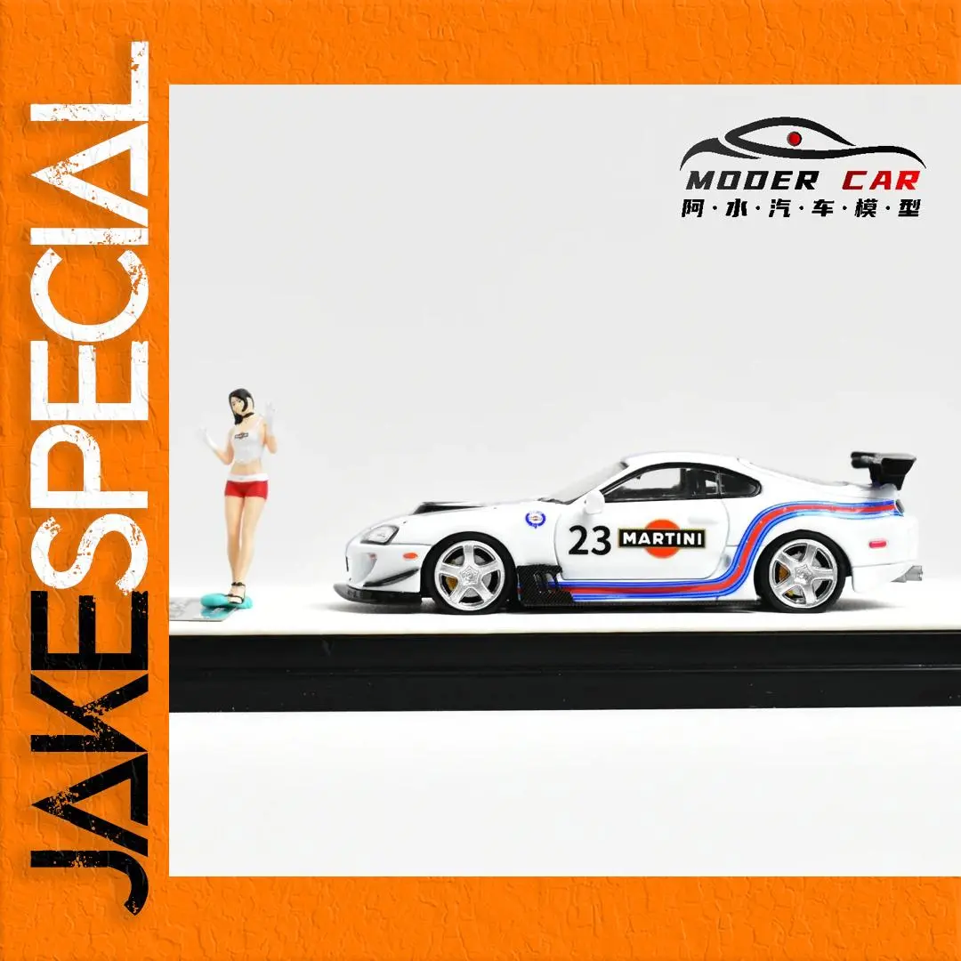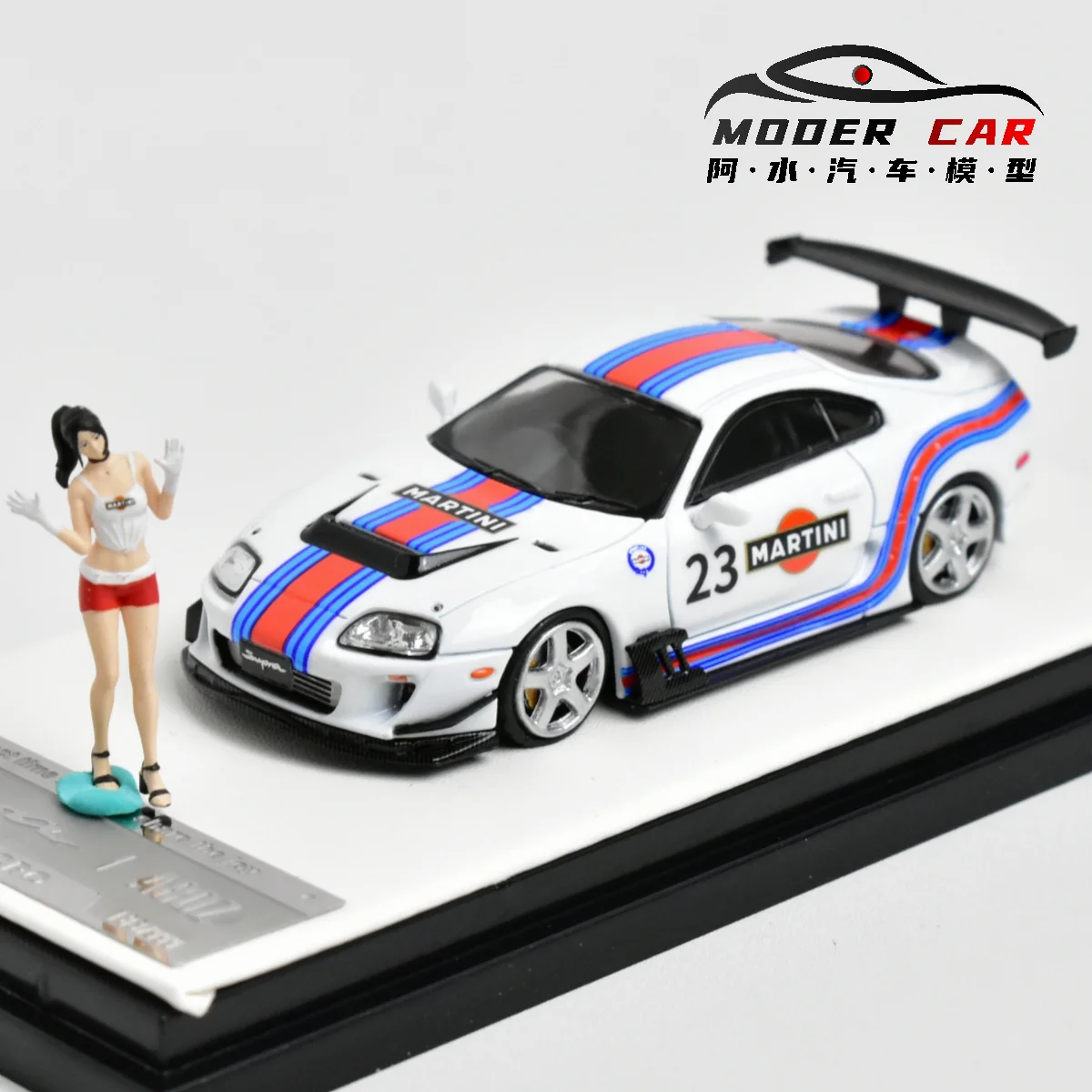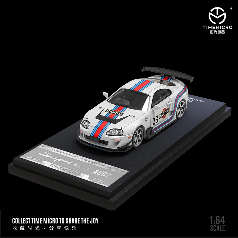 The TM Time Micro 1:64 A80Z diecast model car is a striking collectible designed for enthusiasts. Finished in a predominant white, it showcases bold graphics, including the number “23” alongside the “MARTINI” logo on a vibrant red background. Racing stripes in blue and red accentuate its sporty look, while a black front splitter and rear wing amplify its dynamic presence. Crafted from high-quality metal, this model features shiny chrome multi-spoke wheels, ensuring a refined finish. Battery-free and electrical-free, it is perfect for display. Measuring 1:64 in scale, this model is an ideal addition to any collection.