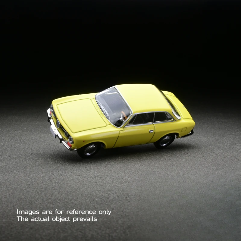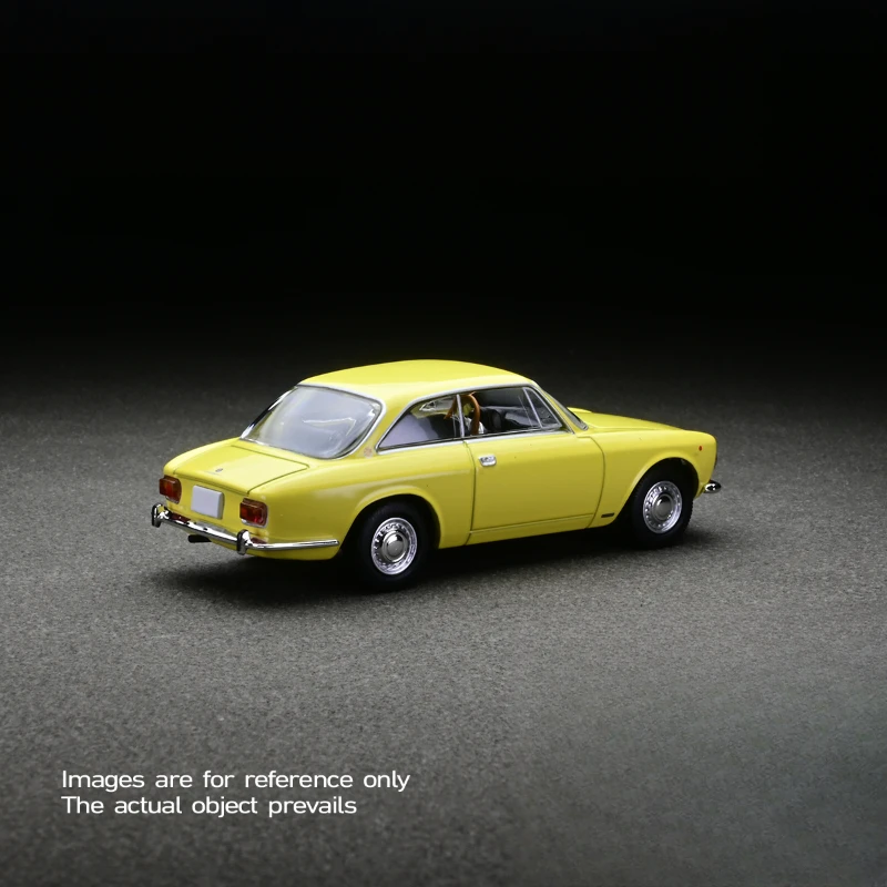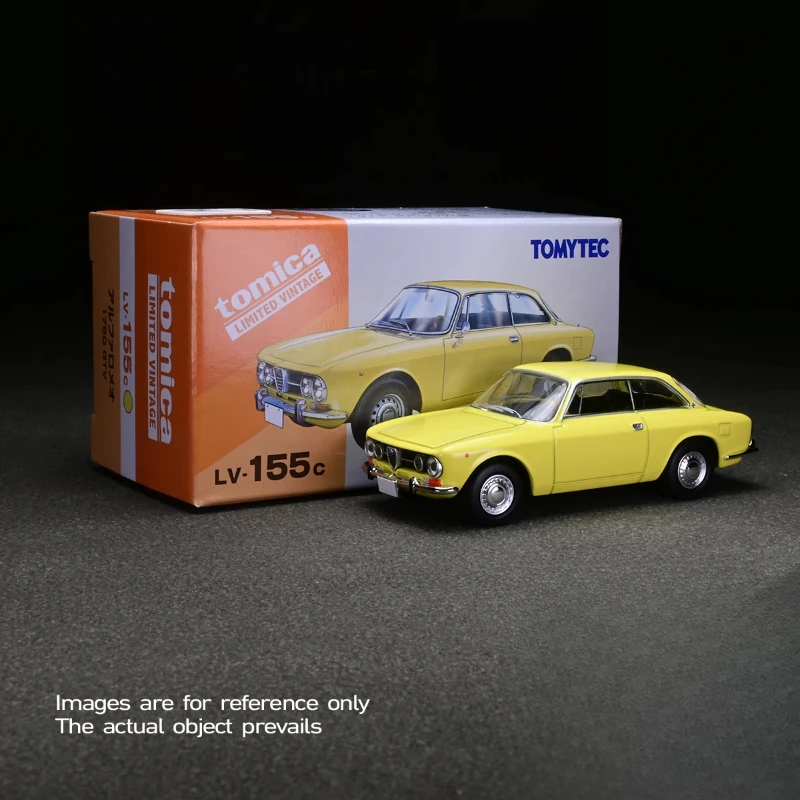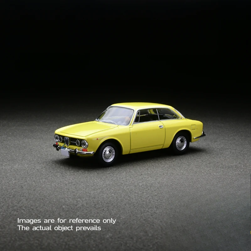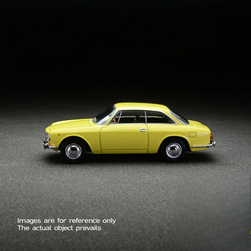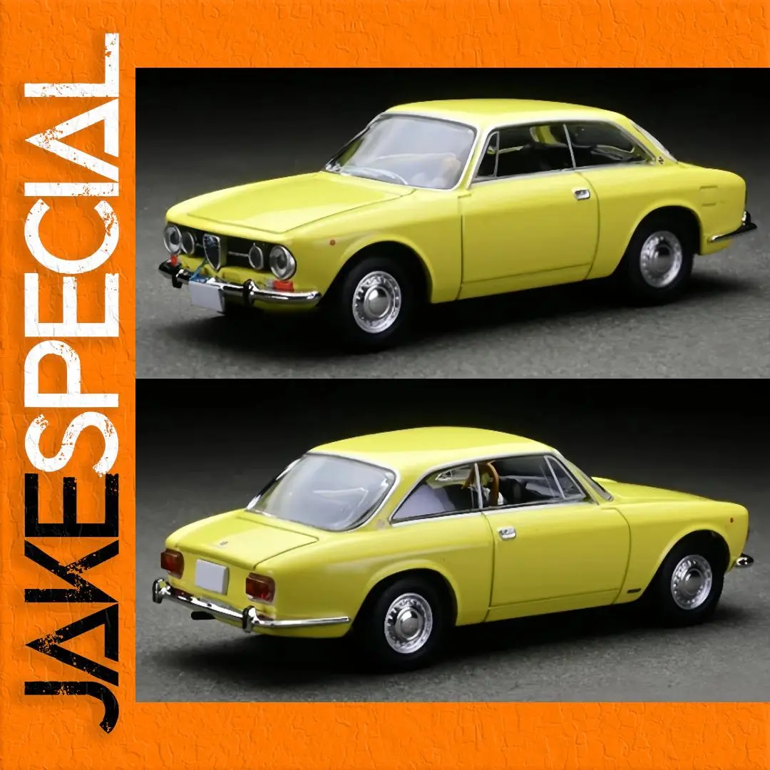 The TOMICA TLV 1:64 LV-155c Alfa Romeo 1751 GTV is a stunning die-cast miniature model, embodying the grace of classic automotive design in a lively yellow finish. This carefully crafted model exhibits smooth lines and curves reminiscent of iconic Alfa Romeo vehicles, featuring meticulous detailing such as a distinctive grille and round headlights. Its two-door configuration emphasizes its sporty aspect, while clear plastic windows reveal an interior with a simplified dashboard and steering wheel. Mounted on a sleek black base, this model is perfect for displaying or gifting to enthusiasts, serving as an exceptional representation of automotive artistry.