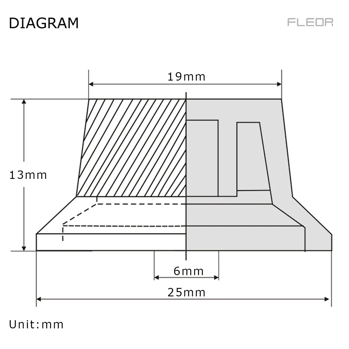- Has a top diameter of 19mm, bottom diameter of 25mm, and a height of 13mm, with a 6mm internal diameter for easy mounting on standard potentiometer shafts.