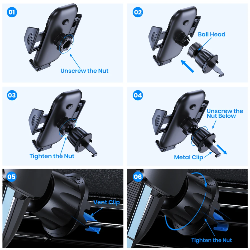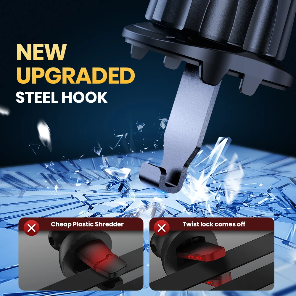 - It securely attaches to air vents using an upgraded hook clip design, providing a firm hold that withstands bumpy roads, potholes, and rough driving conditions without slipping or falling.