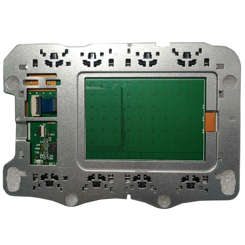 The TouchPad Mouse Buttons Board is specifically designed for HP EliteBook models 840 G3 and 745 G3, offering a sleek and modern silver metallic finish with an anodized touchpad for enhanced durability. This assembly features a flat rectangular touchpad, two recessed mouse buttons for ease of use, and a small green indicator light for functionality status. Framed by a black border with rounded corners, it includes rubber or foam pads for grip. This part has a three-month warranty related to keyboard and fan components and is a perfect replacement to seamlessly integrate with your HP EliteBook.