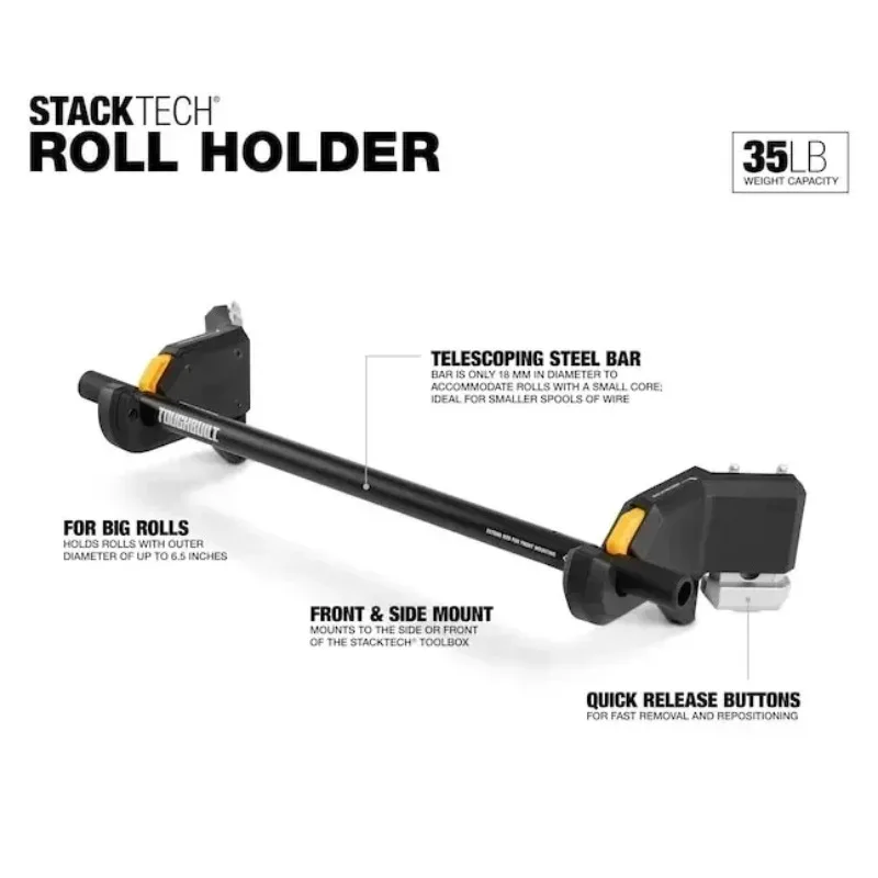The TOUGHBUILT TB-B1-A-32 STACKTECH Paper Towel Holder combines rugged, industrial design with practical functionality. Featuring a durable telescoping steel bar with an 18 mm diameter, it supports rolls up to 6.5″ in outer diameter and has a maximum load capacity of 35 pounds. The holder’s versatile mounting options allow installation on the front or side of a toolbox, with quick-release buttons for effortless removal and repositioning. Made from plastic and metal with striking black components enhanced by vibrant yellow accents on the brackets, this modular, stackable accessory offers a robust solution for organizing small-core rolls, wire spools, and heavy-duty tasks in demanding work environments.