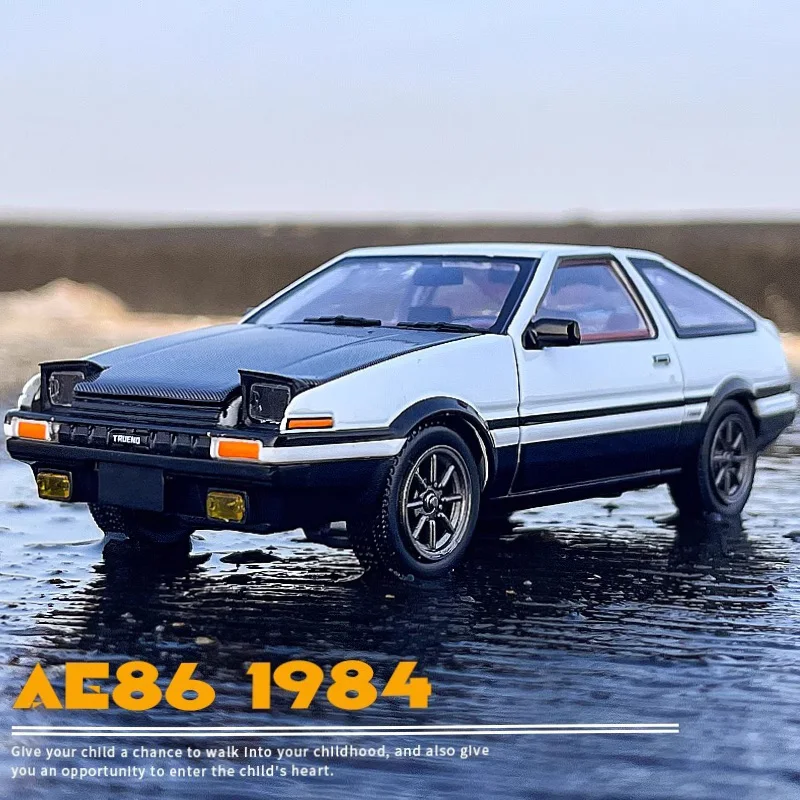 Experience the classic charm of the 1:32 scale diecast metal alloy model of the Toyota AE86 from Initial D, crafted with meticulous attention to detail. This collectible features a sleek white finish with contrasting matte black accents on the hood, lower body trim, and window areas, enhancing its vintage sporty appeal. The model showcases realistic alloy wheels with multi-spoke design and treaded tires, along with finely detailed exterior features like pop-up headlights, black grille, and subtle aerodynamic lines. Made from durable metal and available in black, white, or box variants, this model is perfect for display, gifting, or passionate collectors aged 18 and above.